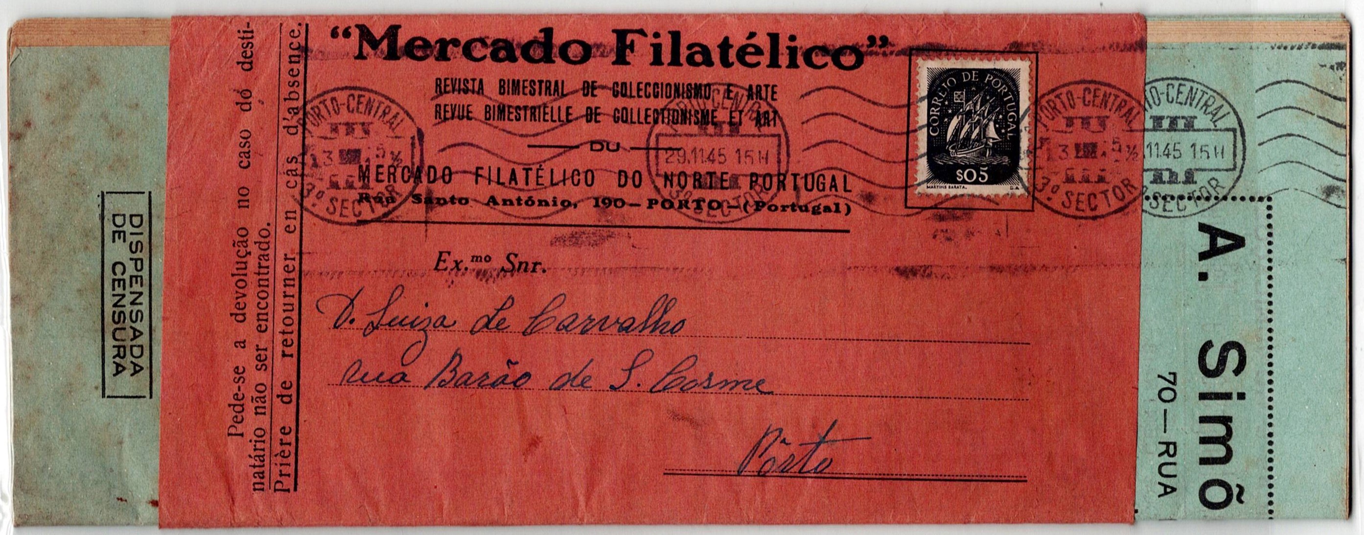 A sealed copy of the magazine “Mercado Filatélico”, sent from Porto on 29.11.1945 to Porto, delivered