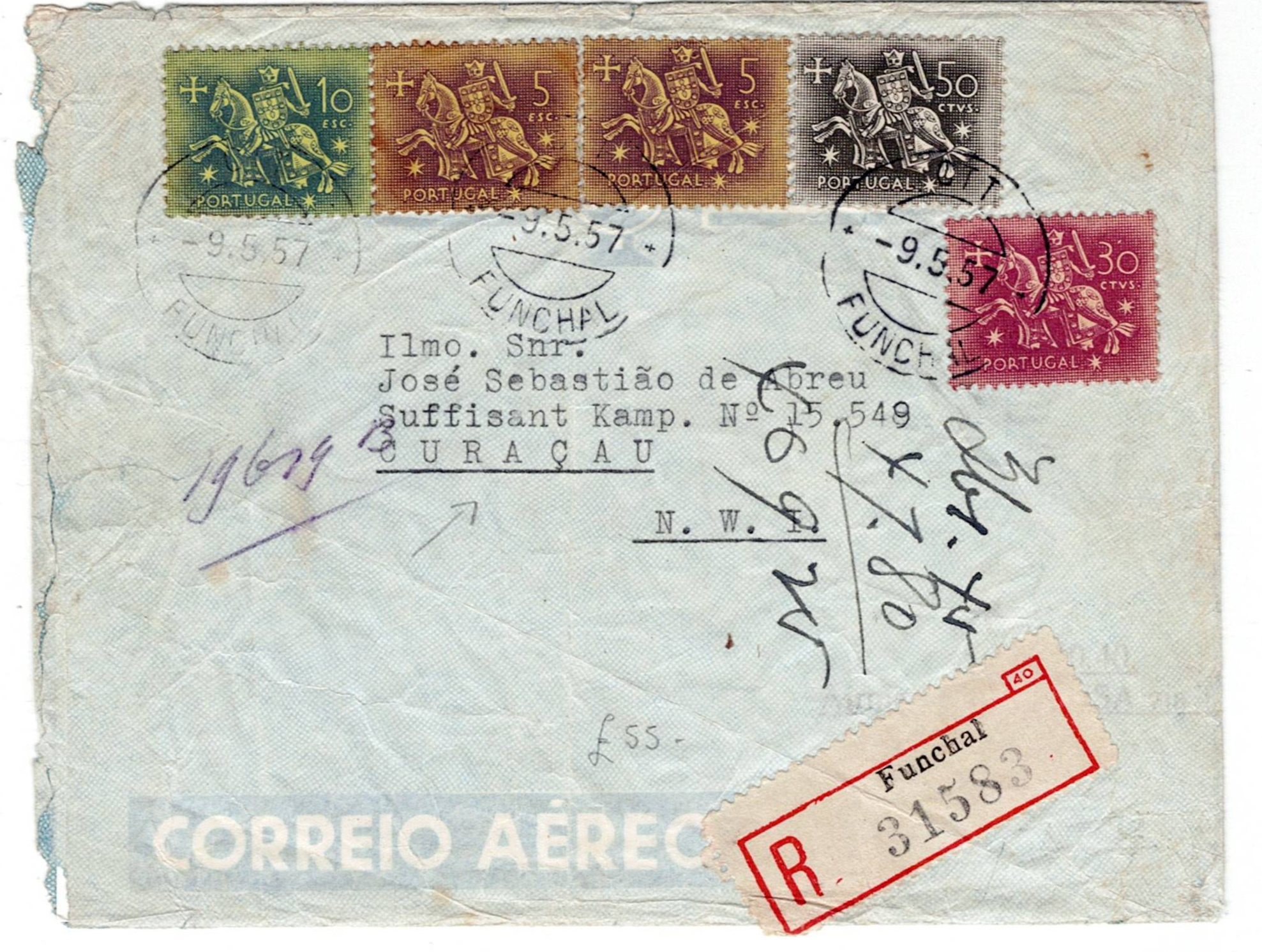 Portugal Issued by D. Dinis. Registered letter from Funchal 9.5.1957 to Curaçao, postage of 20$30,