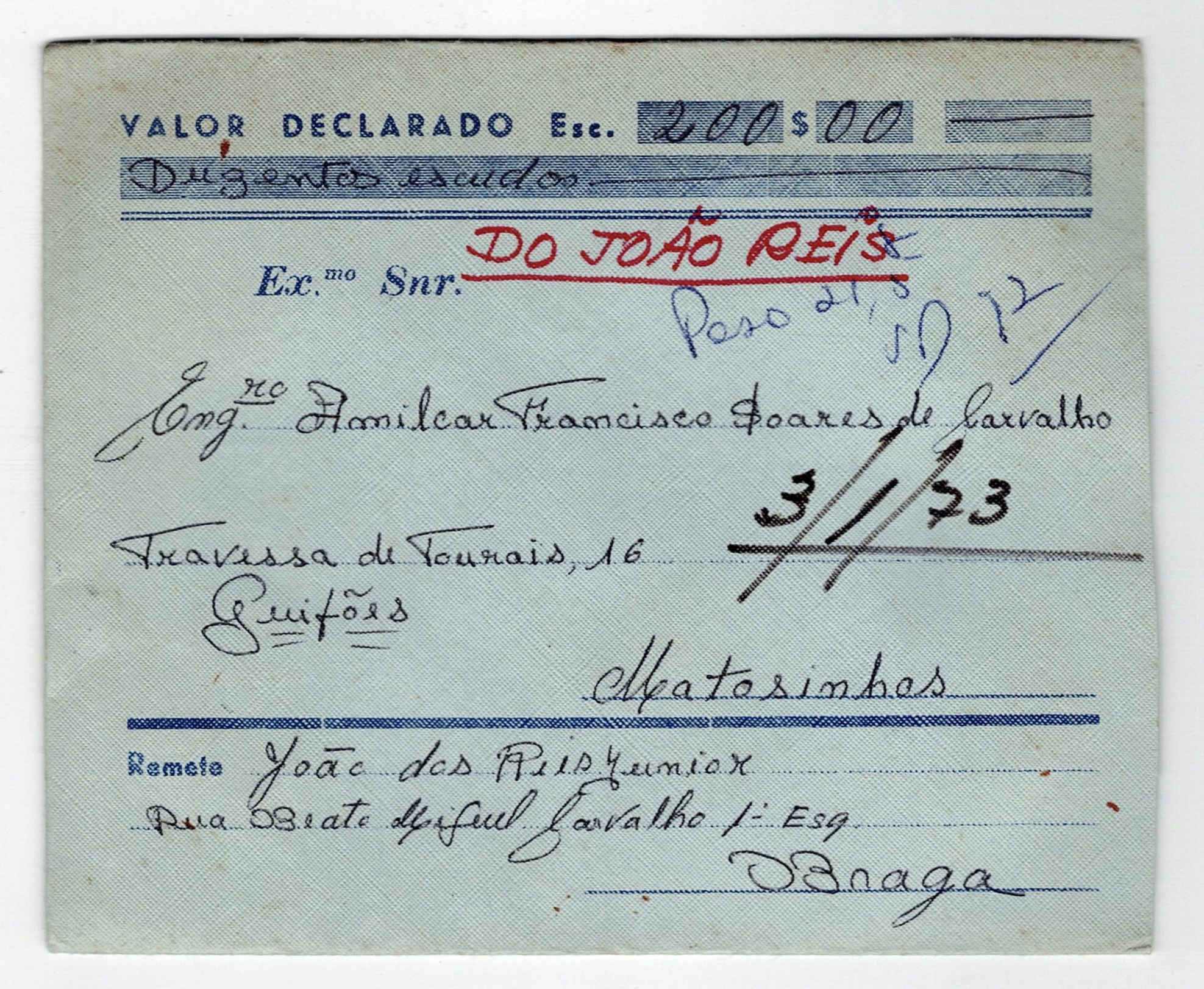 2.1.1973 to Matosinhos. Postage of 9$00 (one stamp of 5$00 and two of 2$00).(Image 1)