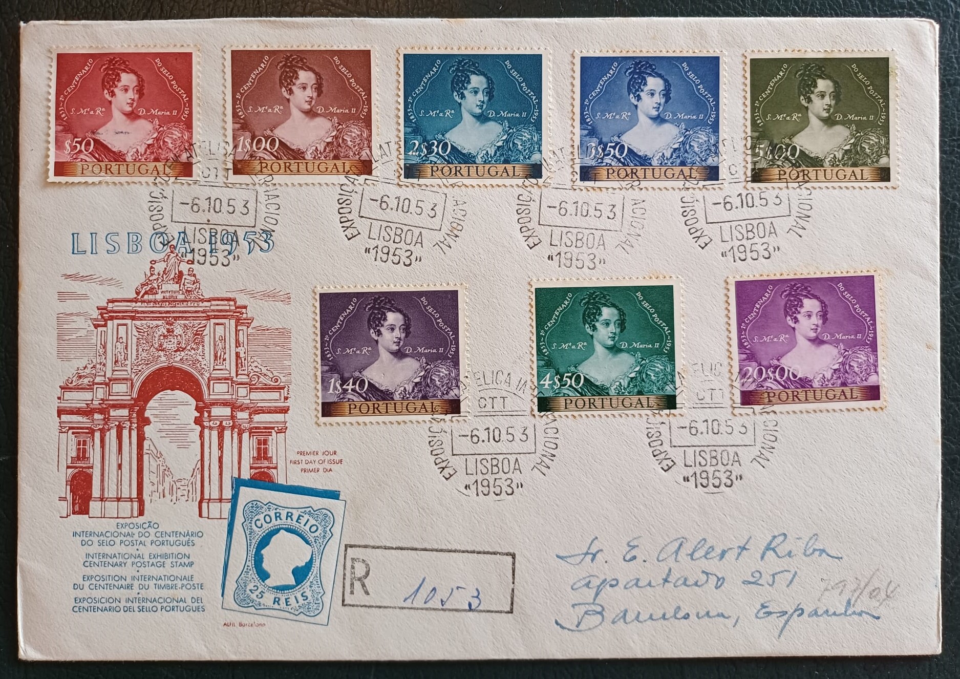 Portugal 1953 1st Centenary of the Portuguese postage stamp. FDC registered circulation to Spain (with