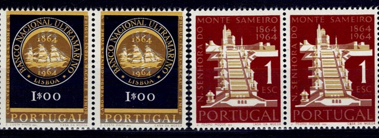 Portugal 1964 BNU + Sameiro. 2 PAIRS of stamps Mf#928+Mf#931 with the printing OFFSET upwards (light