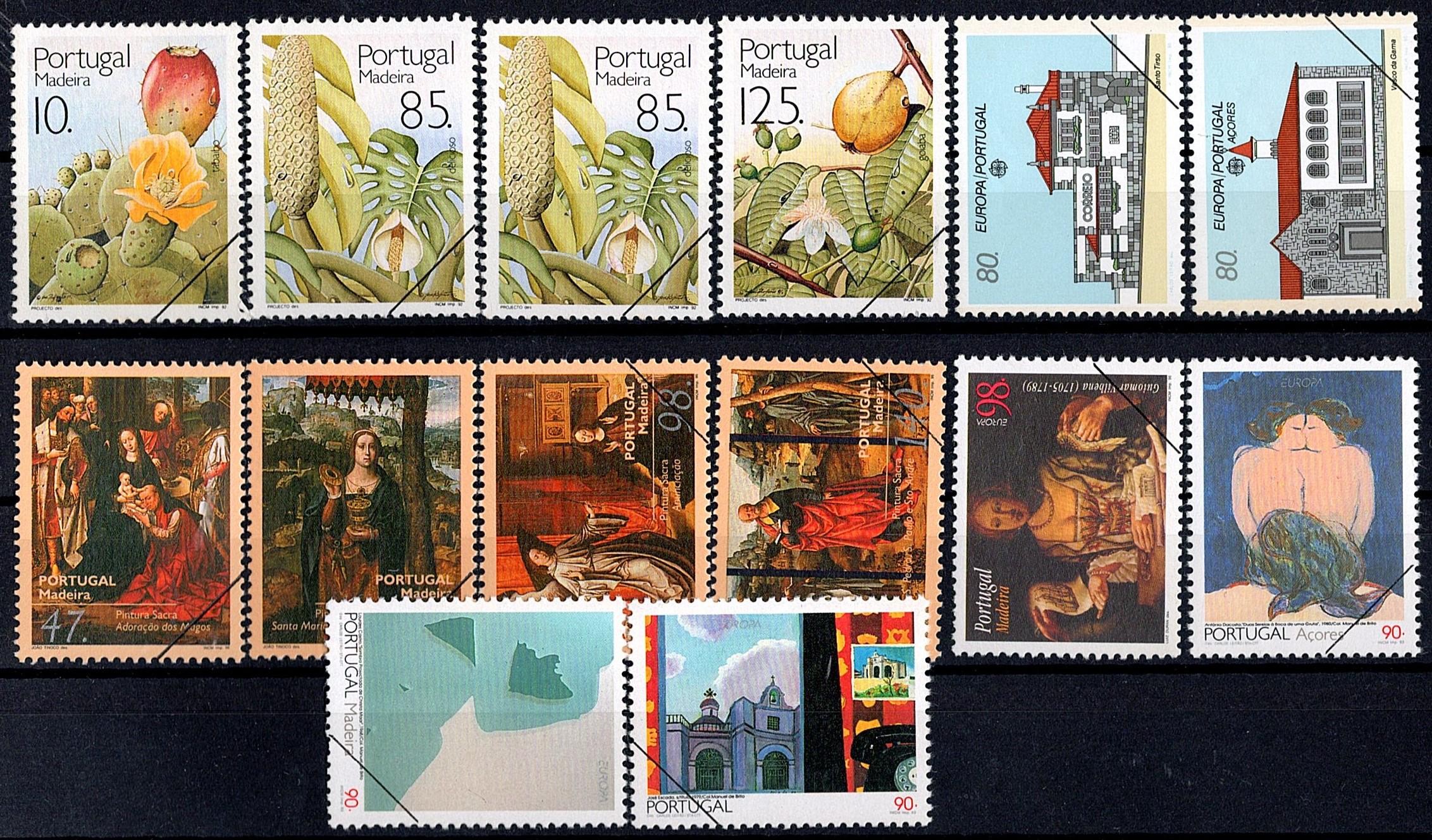 Fruits and Plants of Madeira + Europe * Contemporary Art * Mainland, Azores, and Madeira + Sacred Painting * Madeira. Complete series, new with original gum without hinge, with a "BLACK LINE" diagonally on the lower right corner. Samples distributed