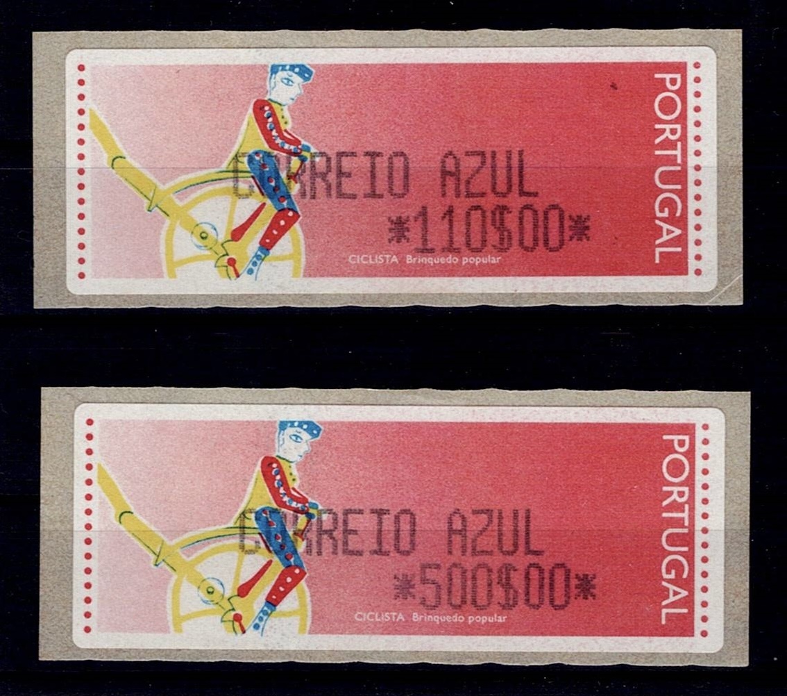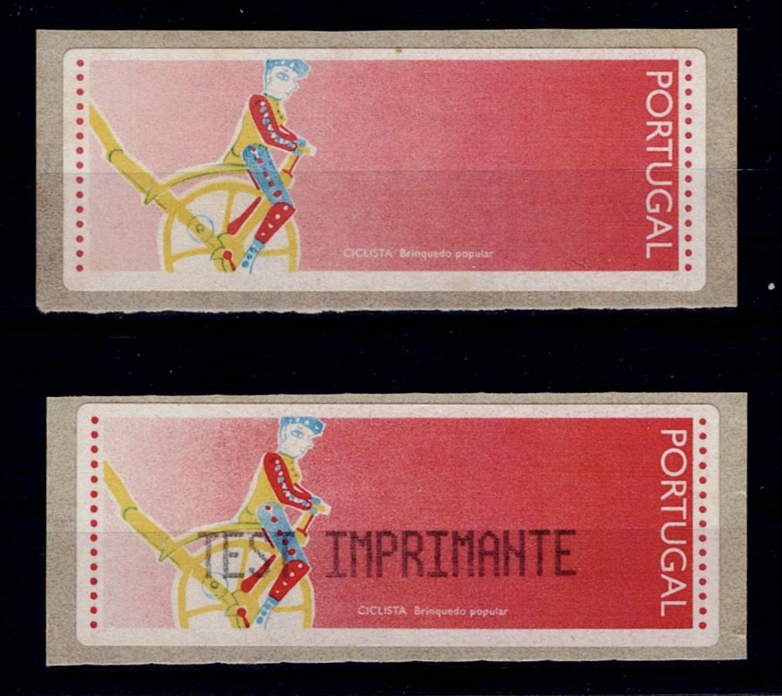 Portugal 1992 – Popular Toys – Cyclist. CROUZET machine. MF#ETQ6, 2 test labels (one without text and