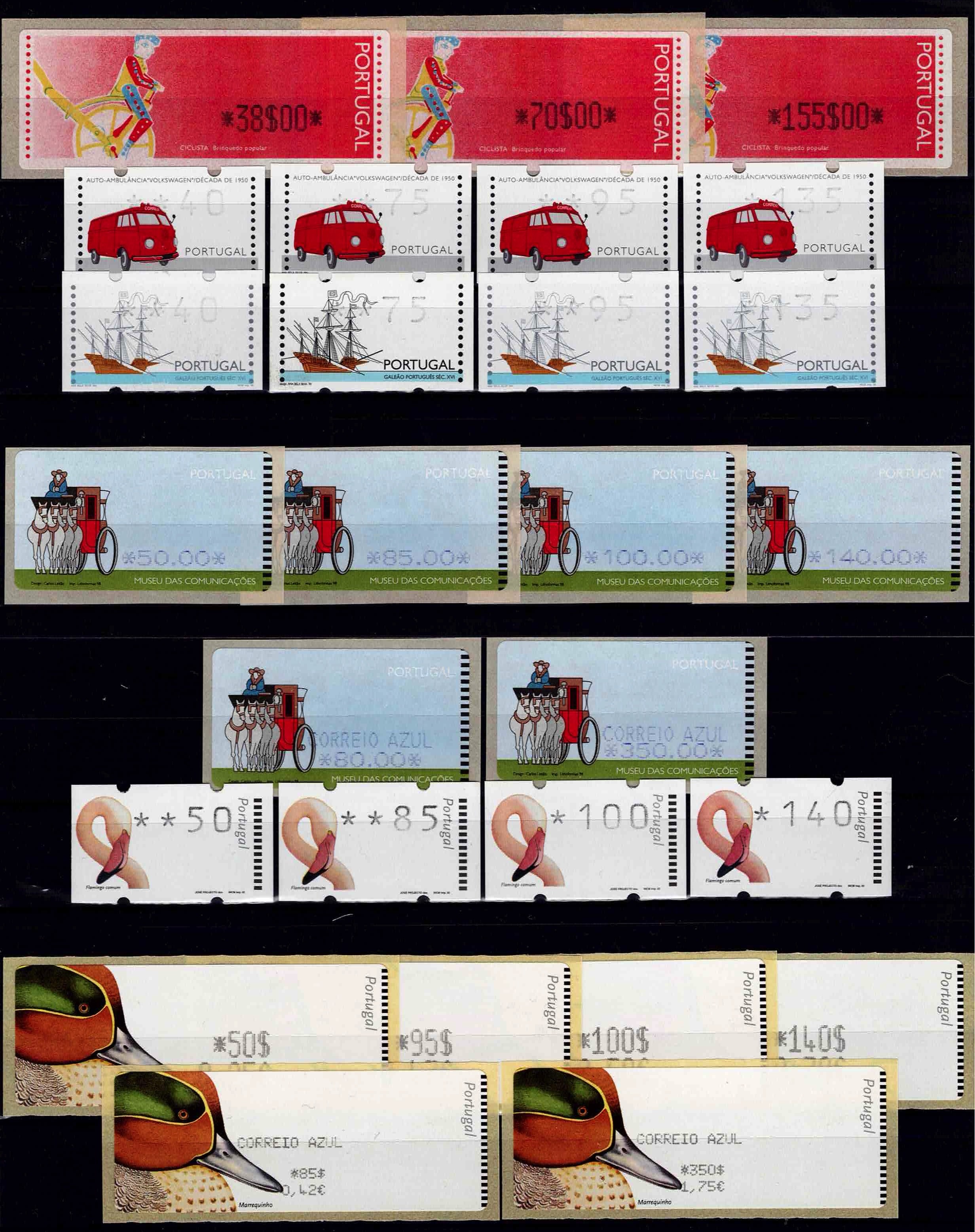 Português, postal transport, Museu das Comunicações, Marrequinho and Flamingo in a set of 3+4+4+6+6+4 labels for ordinary mail + 2x blue mail; values in escudos and Marrequinho series in escudos and euros, printing in violet or black. New copies,