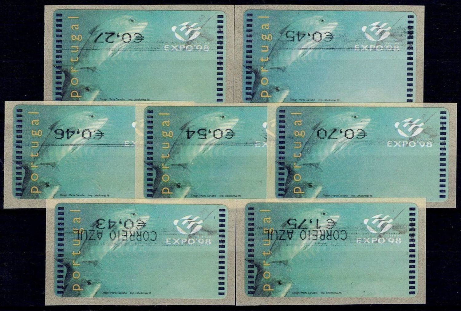 Portugal 2002 – EXPO 98. SMD Machine. Mf#ETQ15Ae+15Al WITH ERROR: REVERSED RATE - set of 5+2 labels for