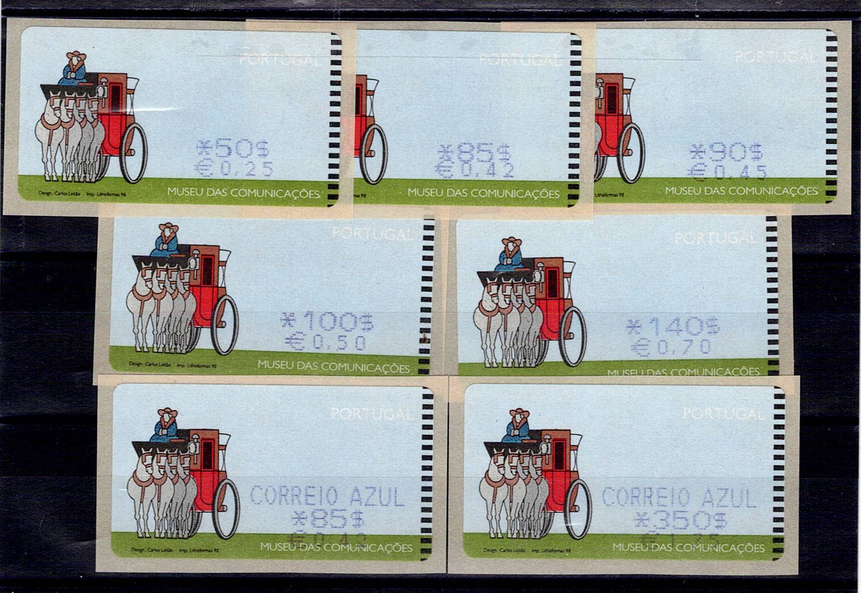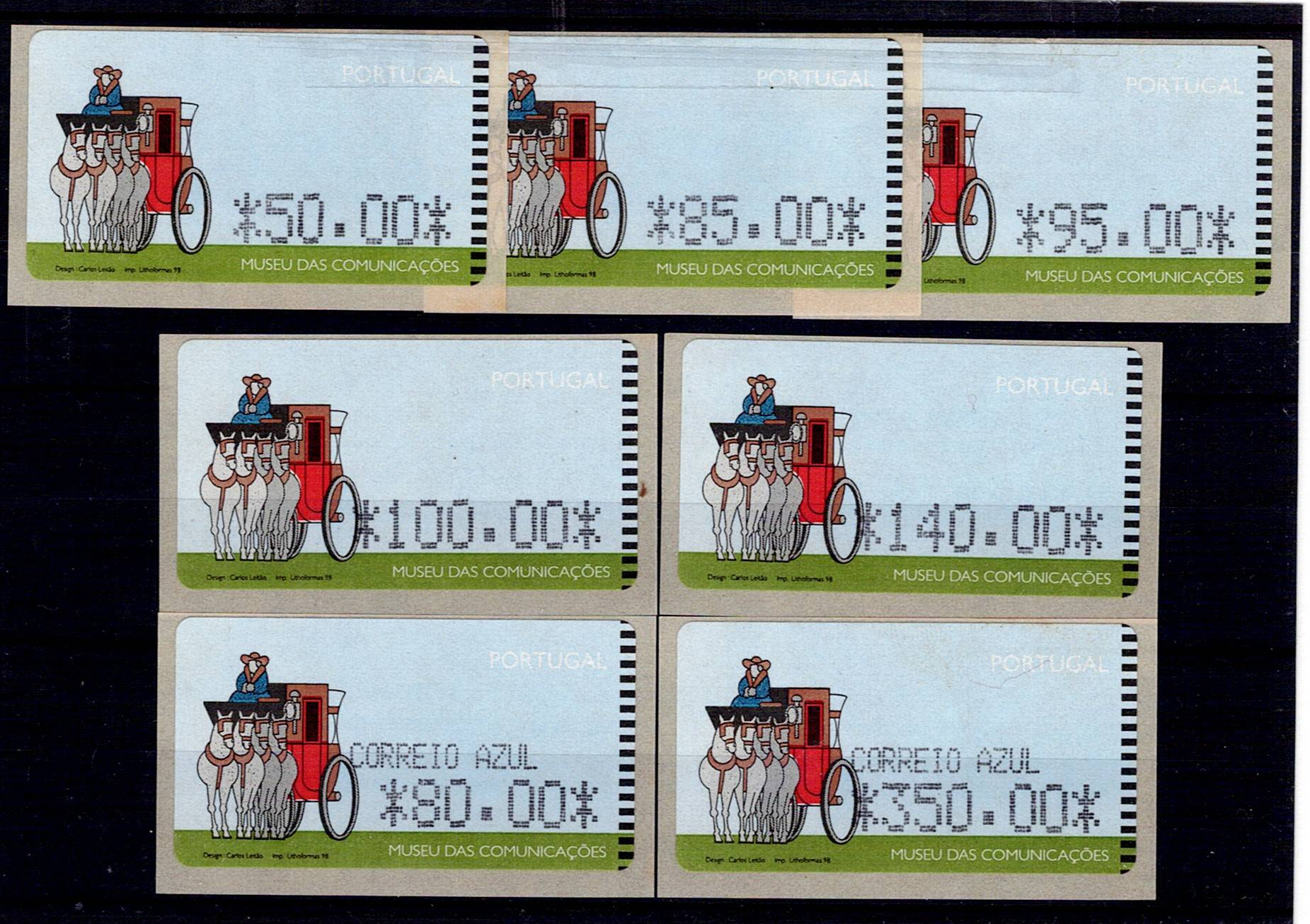 PORTUGAL, 1998, COMMUNICATIONS MUSEUM, SMD MAQ., MF E17A+17Aa, set of 7 labels with ordinary mail and
