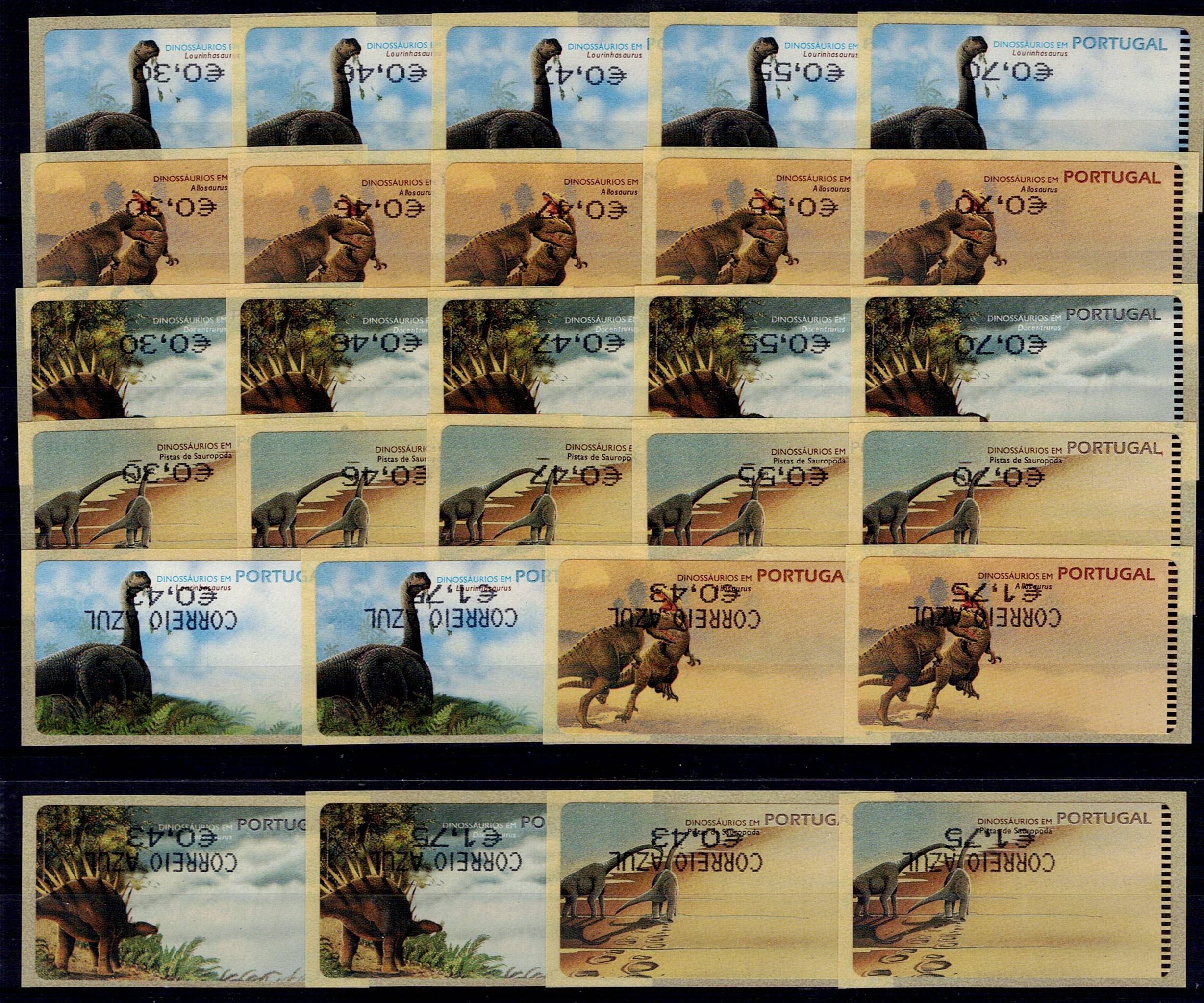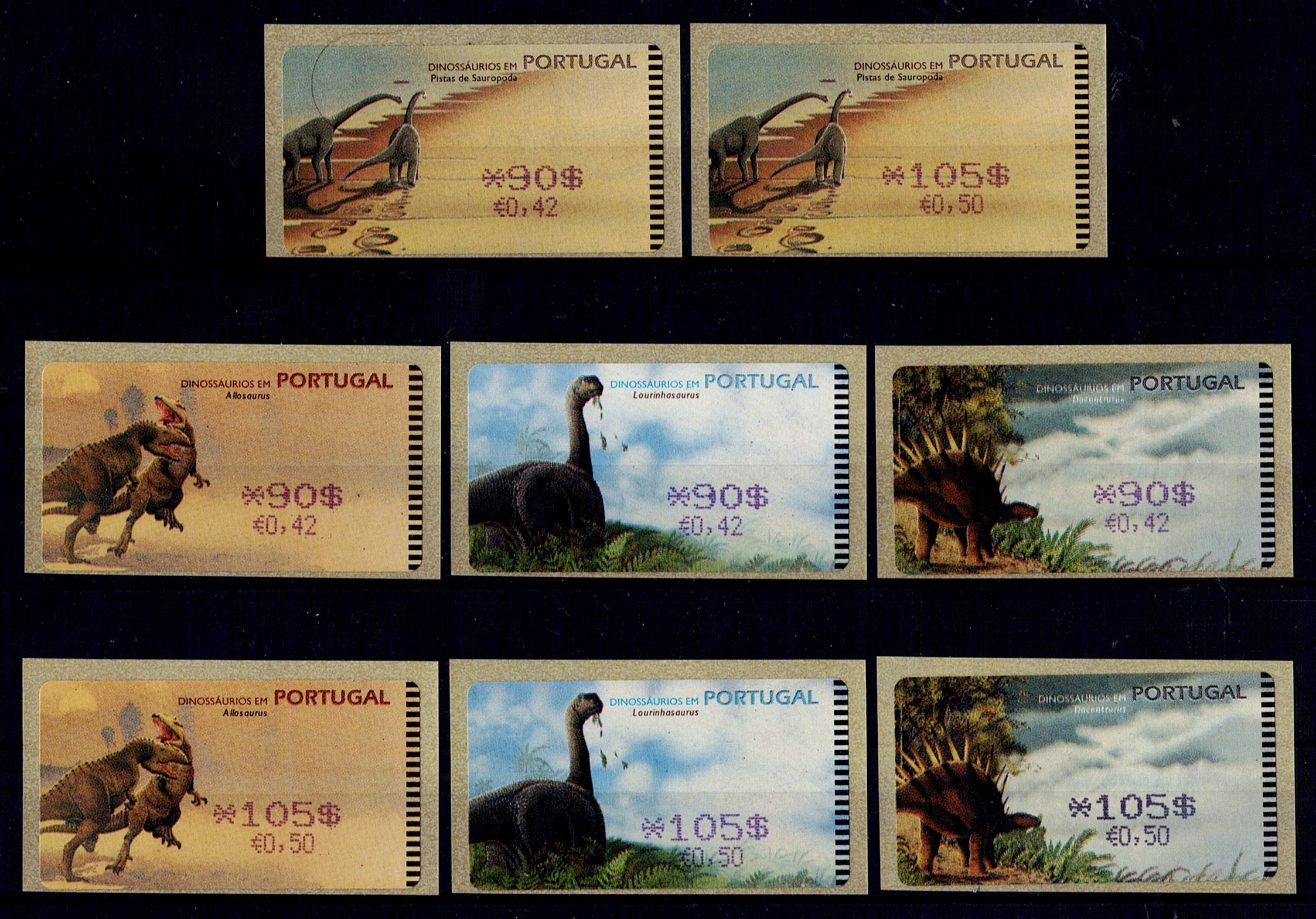 Portugal 1999 – Dinosaurs in Portugal. Set of 8 stamps with violet stamp mark and ERROR in the