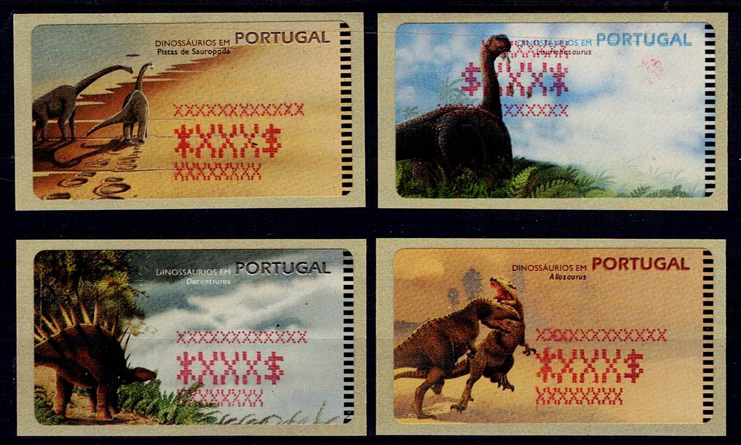 Portugal 1999 – Dinosaurs in Portugal. Set of 4 stamps without the tax imprint and with red