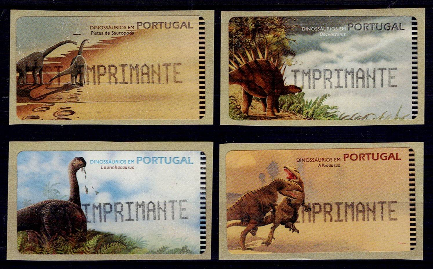Portugal 1999 – Dinosaurs in Portugal. Set of 4 stamps without the tax imprint and with TEST IMPRIMANTE