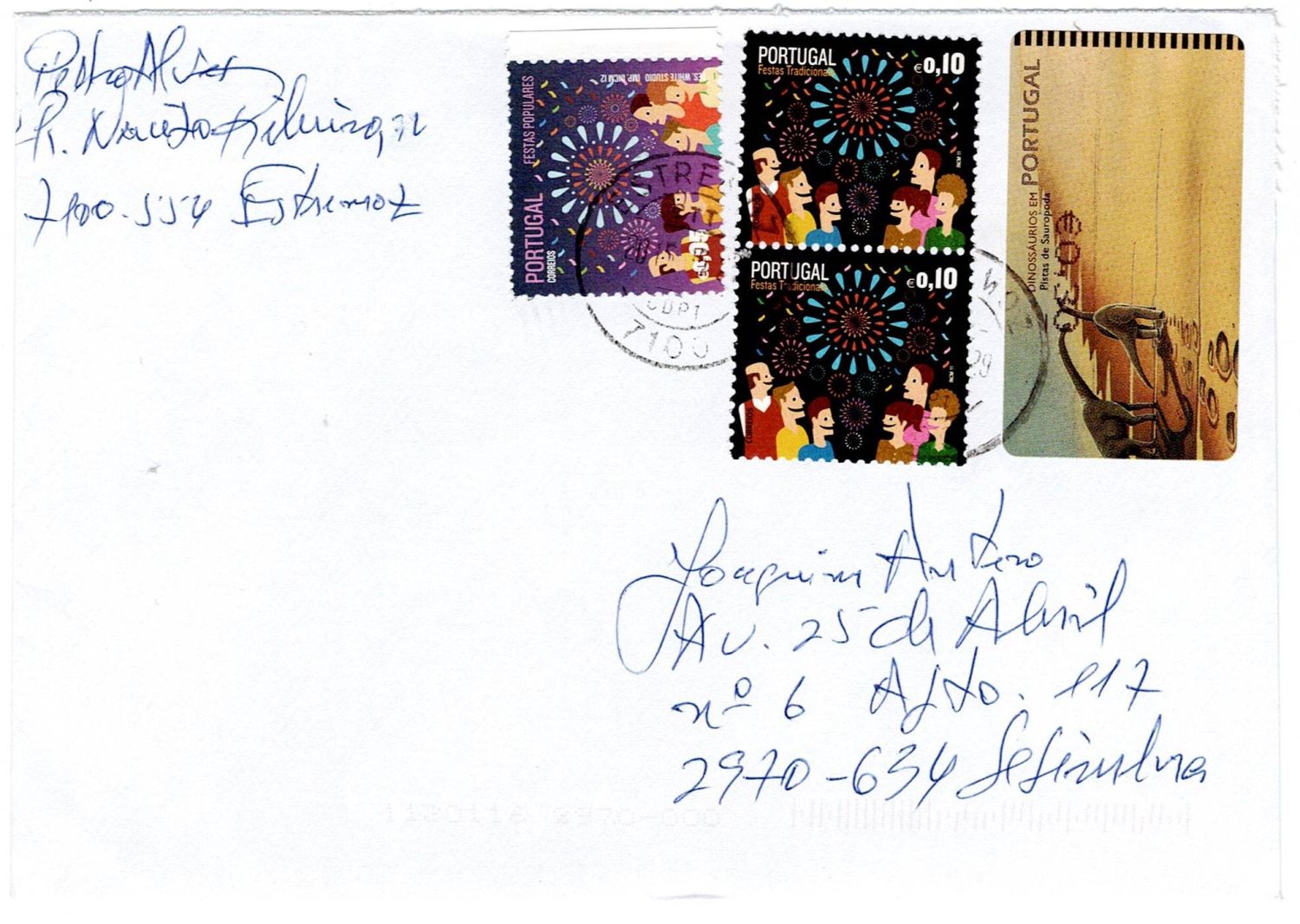 Portugal 2015. Blue post letter, with mixed postage of stamps and label (FROM THE DINOSAUR ISSUE IN