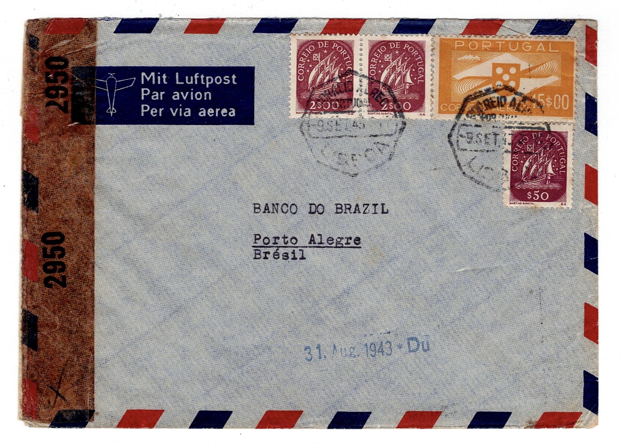 Lisbon, where on 9.9.1943 it was franked with 19$50 (airmail stamp of 15$00, pair of 2$00 and $50 Caravel), opened by the Censorship, to Rio de Janeiro, having arrived on XI.43. Rare(Image 1)