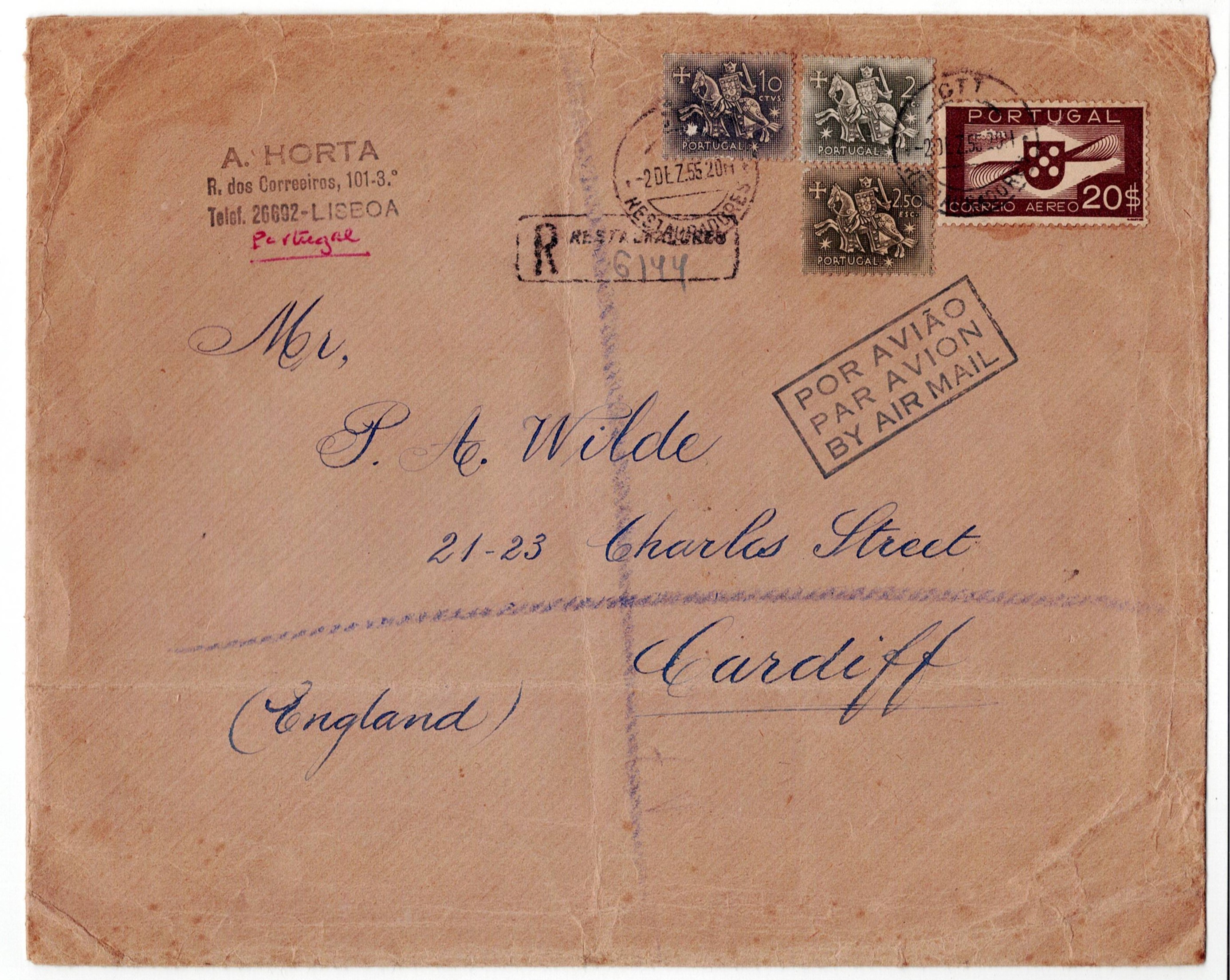 Airmail. Letter registered in Lisbon on 20.12.1955, sent by the philatelic dealer António Horta, to