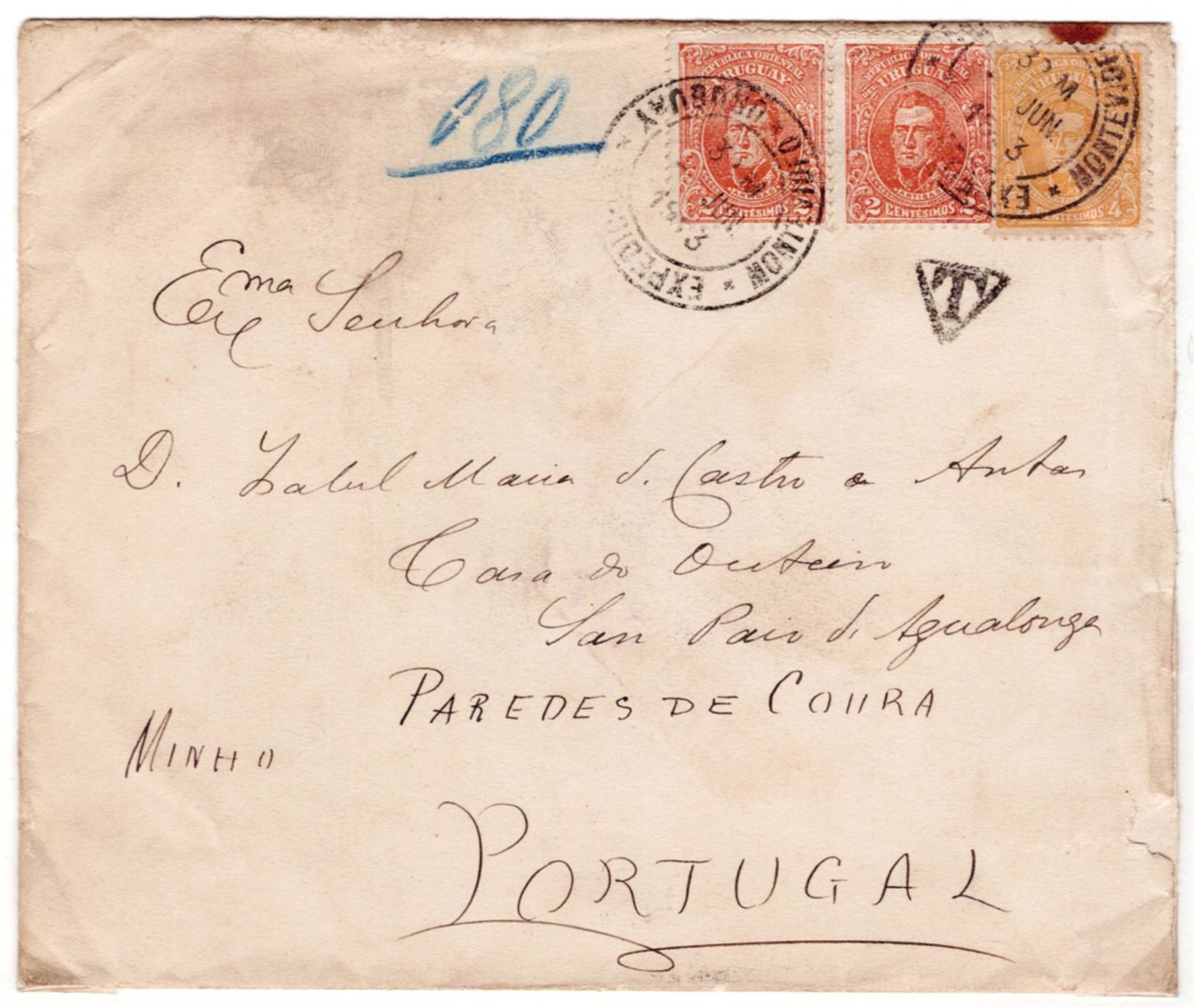 Letter sent (4.6.1913) from Montevideo to Portugal, franked with 8 cents in Uruguayan stamps, which, as