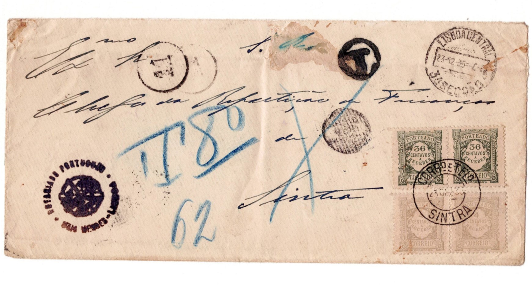 on (23.12.1935) to the Head of the Sintra Finance Department, and therefore exempt from postage. The original postage is handwritten on the back, stating that "in the table of authorized authorities, correspondence with the notices may be requested,