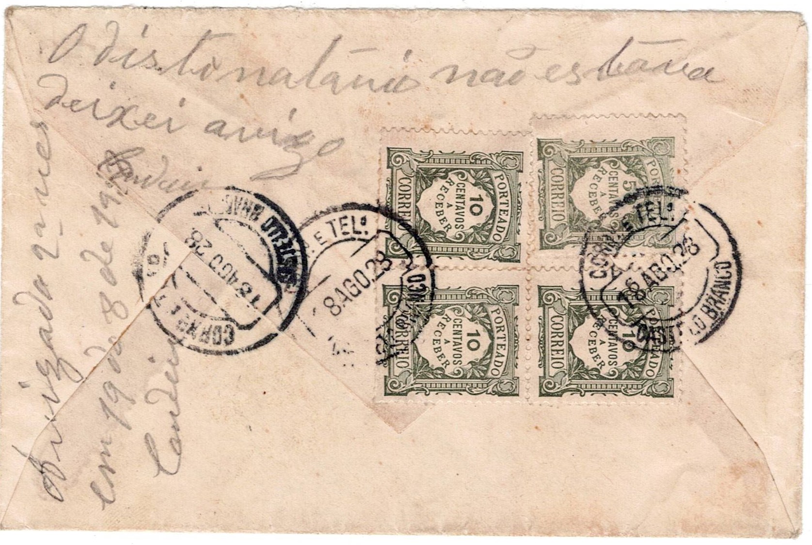 (17.8.1928) by rail in the Beira Baixa II mobile postal ambulance. The value of 80 cents in postage stamps was applied to the destination mail (double the missing rate). The steps taken by the postman for its delivery were handwritten: "The addressee