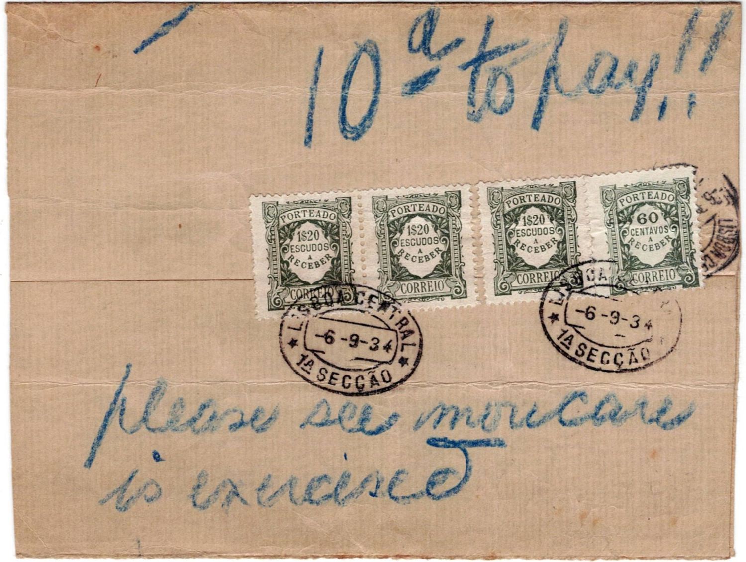 postage, in 4$20, in postage due stamps on September 6, 1934, which the recipient did not want to pay, so it was returned to the sender in London, with 10d unpaid. This circumstance led someone at the post office to write with a blue pencil: “Please