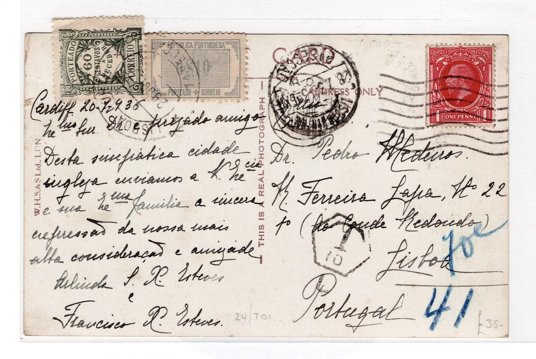 1771 imagePostage. Portugal. Illustrated postcard sent from Cardiff on 20.7.1936, insufficient postage of 1d, postage T/10, paid a fine of 70 cents, with postage stamps of 60 and 10 cents €10(Image 1)