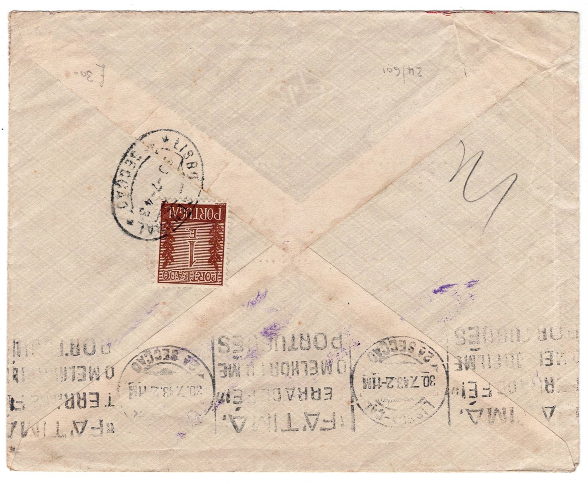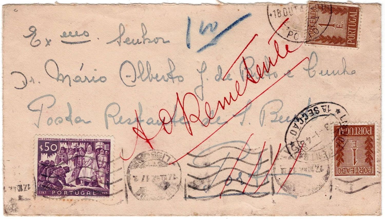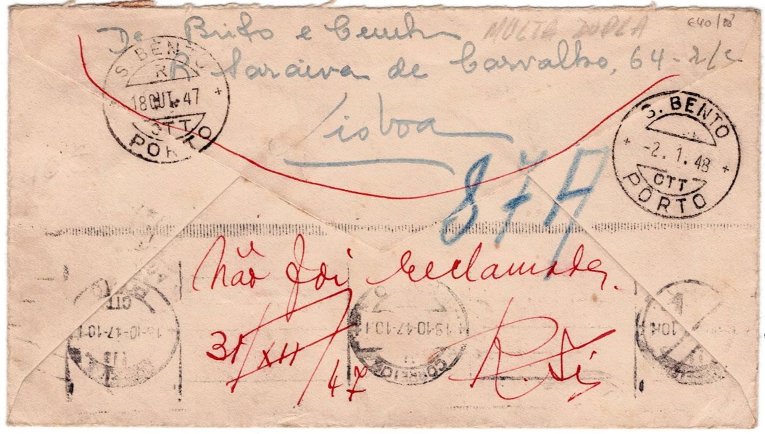 1772 imagePortugal Charged. Letter sent from Lisbon, postage of $50, and intended for poste restante in Porto. Not being claimed, it was returned to the sender, and charged 2$00, to be paid in Lisbon. It was doubly charged 1$00, first on October 18, 1947 and then with 1$00 on January 3, 1948.(Image 1) (Image 2)