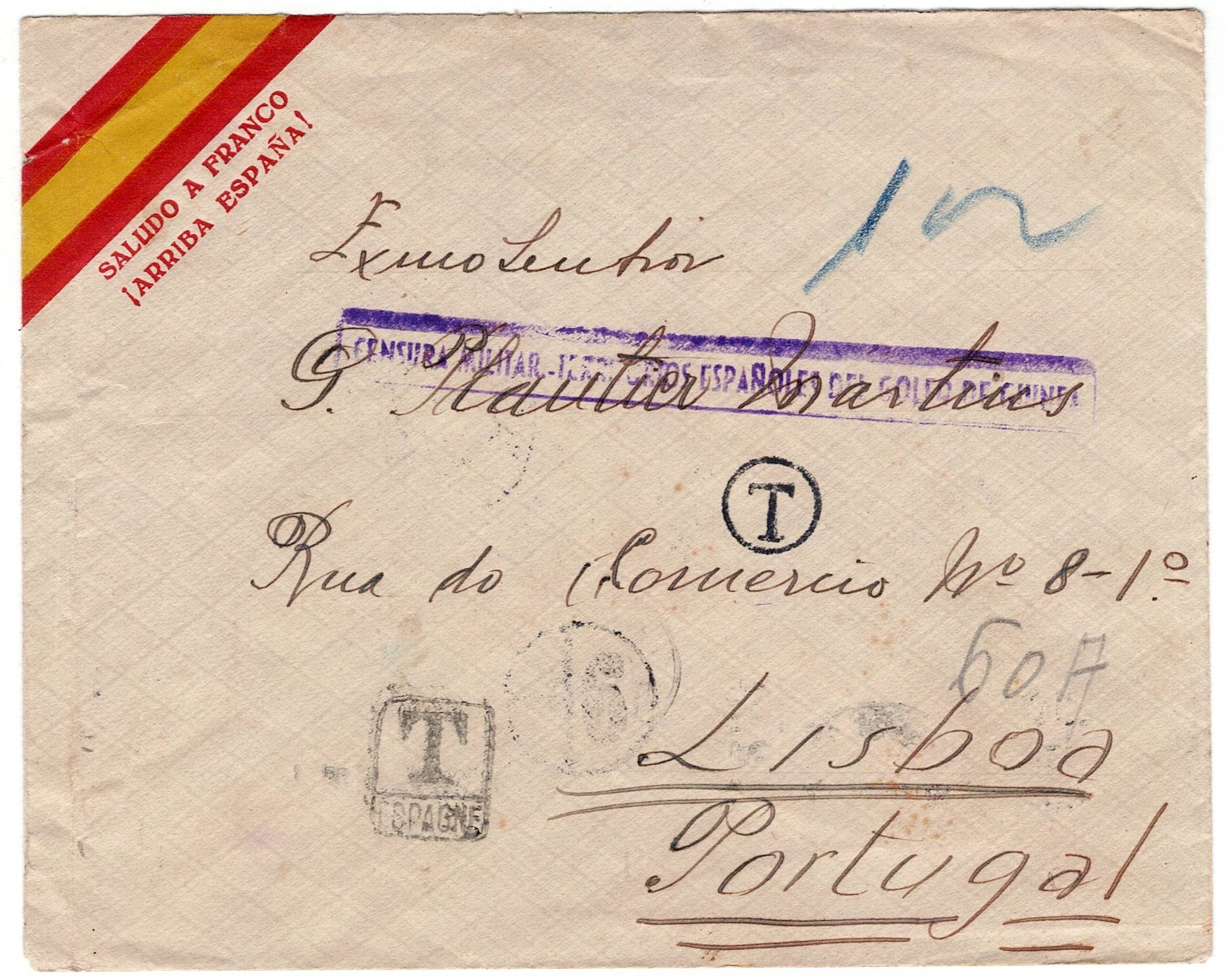 1773 imagePostage Portugal. Spain. 1943. Letter sent from Spain to Lisbon. Not franked, postmarked in Spain and Portugal, with a 1$00 stamp applied in Lisbon on 30.7.1943. Envelope with Francoist greeting, “Saludo a Franco/Arriba Espanha”, and censorship mark “CENSURA MILITAR. TERRITORIOS ESPANOLES DEL GOLFO DE ……..” MB Scarce.(Image 1) (Image 2)