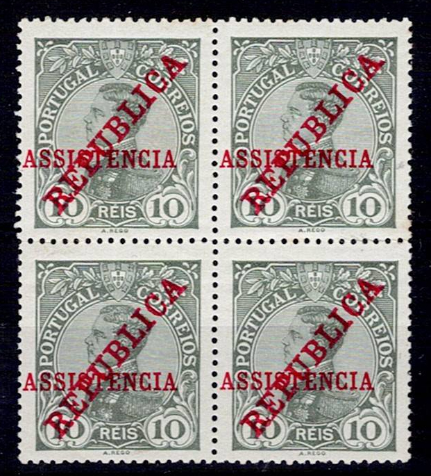 1775 imagePortugal 1911 D. Manuel II, with "Republic" and "Assistance" overprints. QUADRA of Mf#IP2, 10 Reis, green, enamel paper, 14x15 perforation, with ERROR: OVERPRINT DISPLACED to the right. New copies, with original gum and without hinge, good color. Catalogue value € 140.(Image 1)