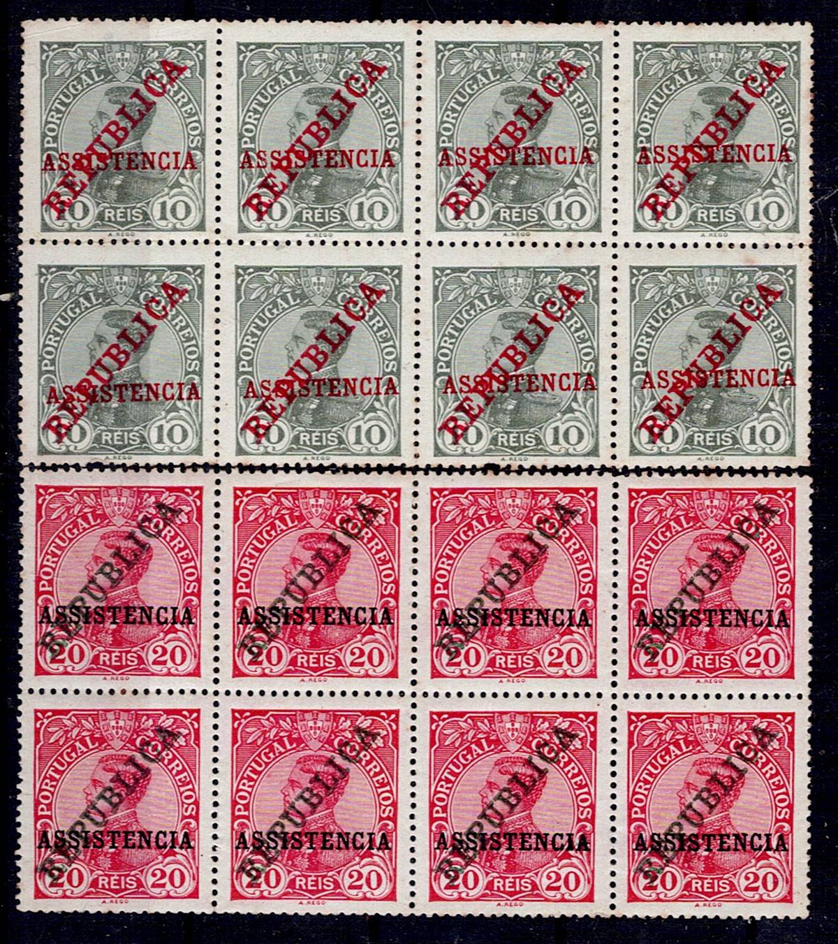 1776 imagePortugal 1911 D. Manuel II, with "Republic" and "Assistance" overprints. BLOCKS of 8 of Mf#IP1-2, 10 and 20 Reis, green and carmine. New stamps, with damaged gum and traces of oxide, with good color. Catalogue value (without gum) € 160.(Image 1)