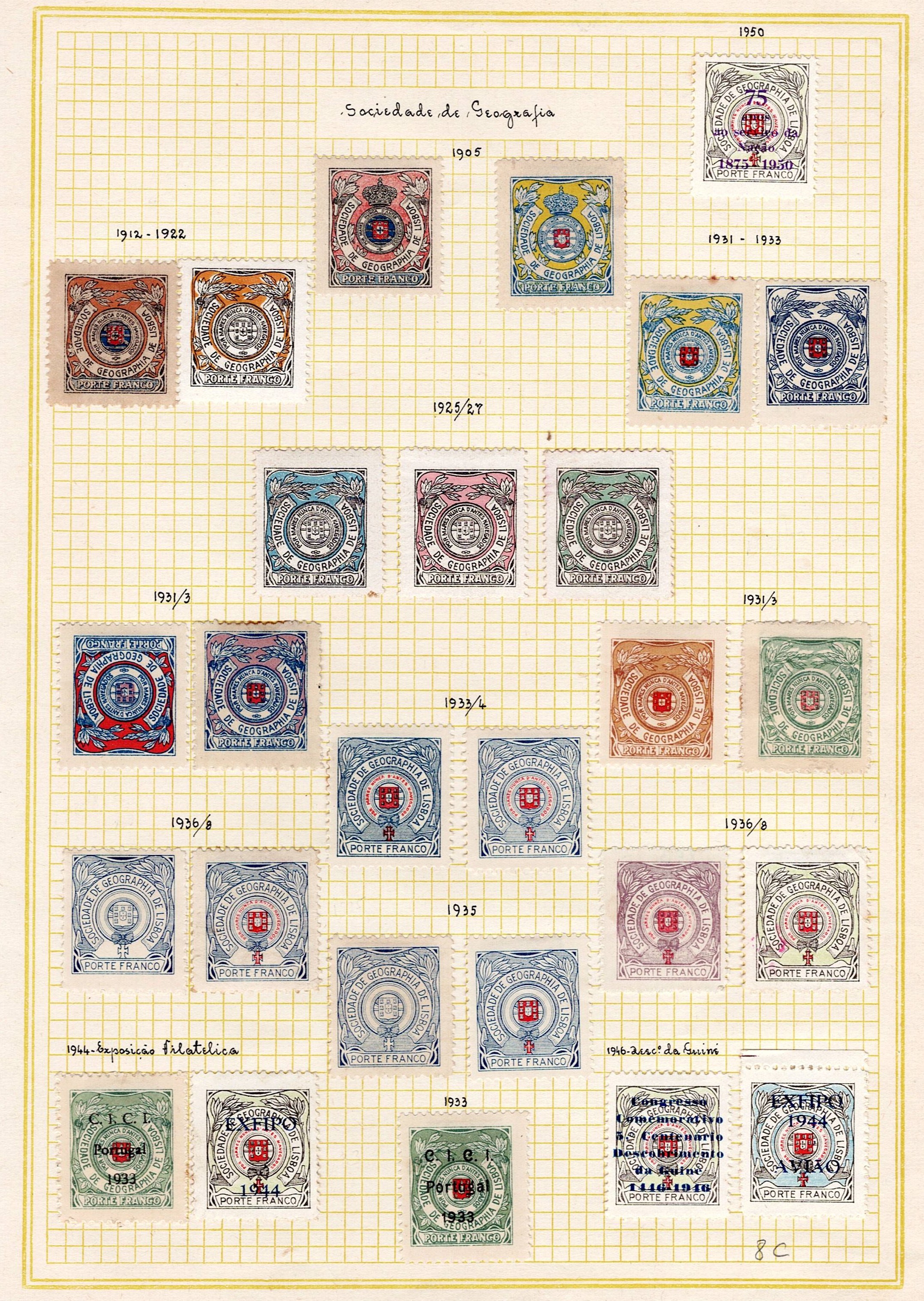 1779 imagePortugal 1903-1938 Porte Franco - Geographical Society. Set of 21 stamps from the Geographical Society, including two CICI-overprinted stamps, varieties A and B, and four commemorative stickers, all attached to a hinged album sheet. New stamps, with good colors and only minor defects. Catalog value €1,123.(Image 1)