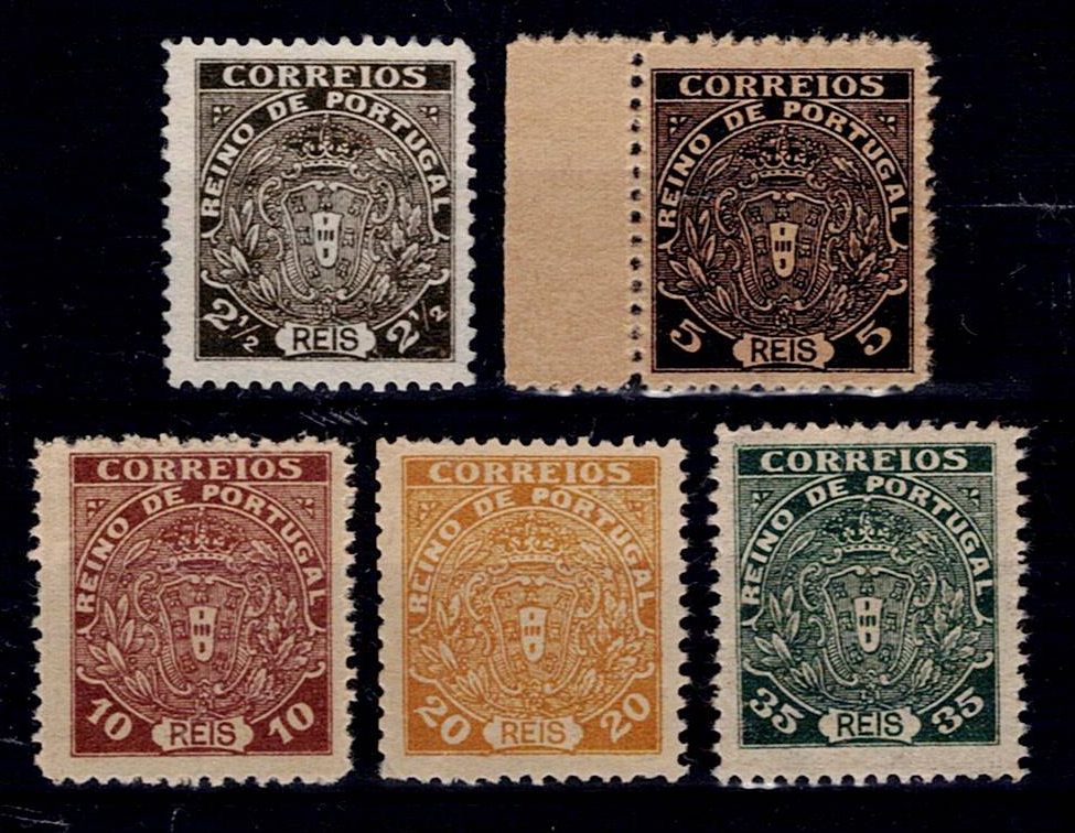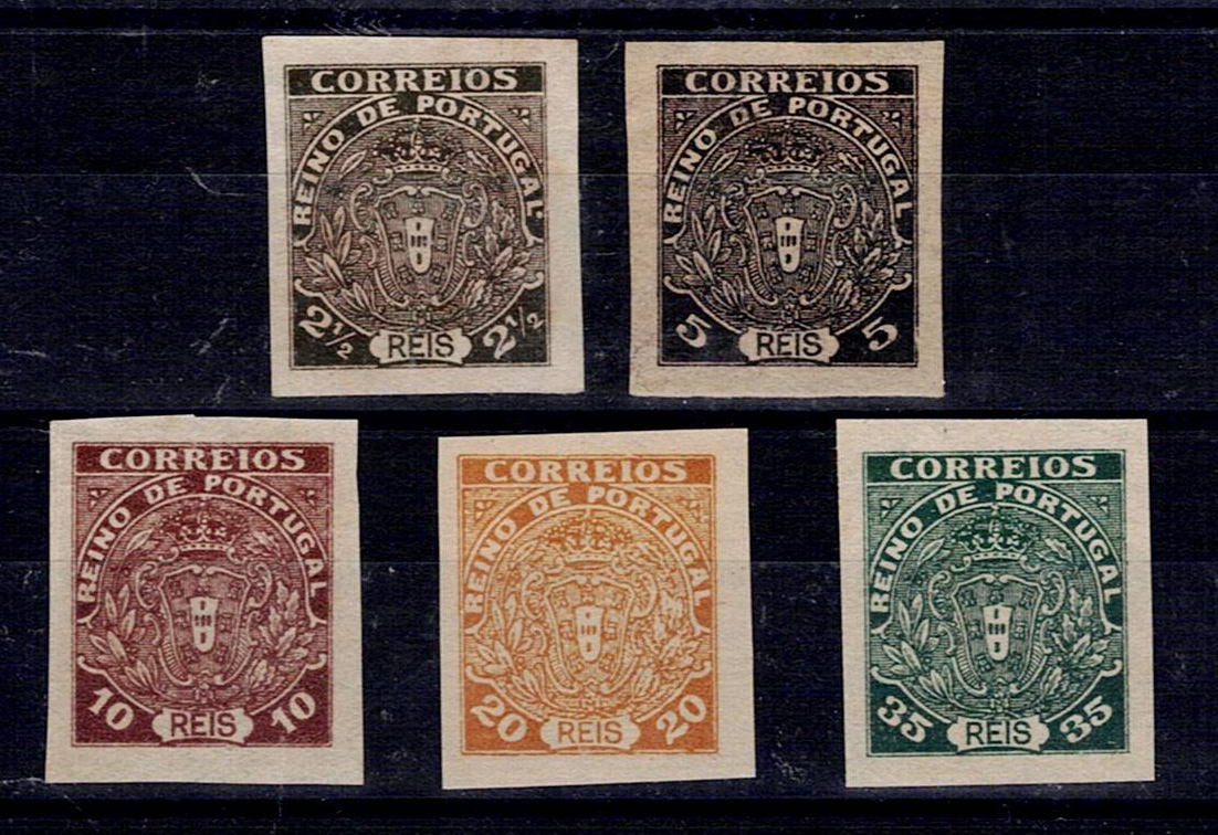 1781 imagePortugal 1919 Northern Monarchy. NOT ISSUED. Mf#ND1-4 + 20 reis yellow. Lot comprising 5 undented stamps on smooth yellowish paper, ungummed: 2 ½ reis in black-sepia, 5 reis in black, 10 reis in brown, 35 reis in green and 20 reis in yellow.(Image 1)