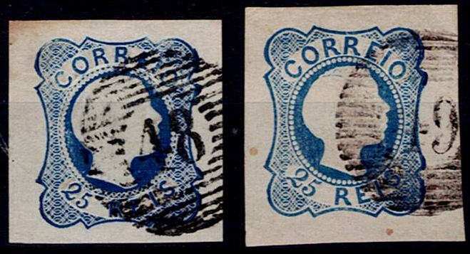 1786 imageAzores 1855-56 Precursors – D. Pedro V, STRAIGHT hair. 2 stamps: Mf#6, 25 réis blue, plain paper, type I, pearls separated, obliterated with a 20-bar stamp beaten in black “49 – HORTA (AZORES)” + Mf#7, 25 réis blue, plain paper, type II, pearls together, obliterated with a 20-bar stamp beaten in black “48 – ANGRA (AZORES)”. Catalogue value €235.(Image 1)