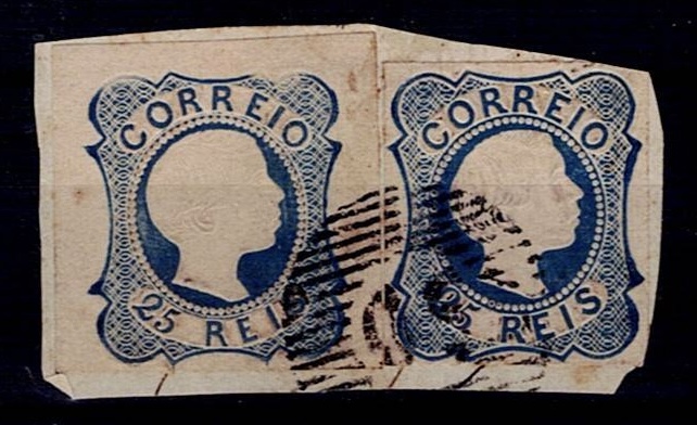 1787 imageAzores 1855-56 Precursors – D. Pedro V, STRAIGHT hair. Fragment with 2 stamps Mf#6 (right) and Mf#7 (left), 25 réis, blue, plain paper, type II and I respectively. Used copies, normal to very short margins, with good colour, obliterated with a 20-bar stamp struck in black “50 – PONTA DELGADA (AZORES)”. Catalogue value €260.(Image 1)