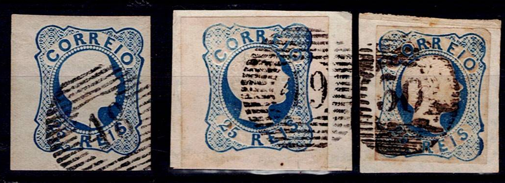 1788 imageAzores 1856-58 Precursors – D. Pedro V, curly hair. 3 stamps (2 on fragment) Mf#12, 25 réis blue, plain paper, double lines, obliterated with a 20-bar stamp struck in black “48 – ANGRA (AZORES)” + “49 – HORTA (AZORES) + “50 – PONTA DELGADA (AZORES) . Catalogue value € 420 .(Image 1)