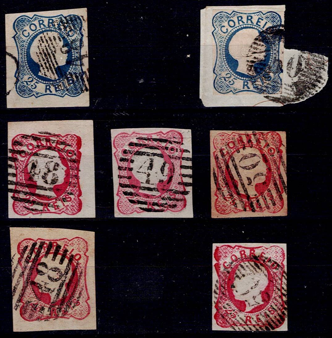 1789 imageAzores Precursors 1855 to 1864 D. Pedro, straight and curly hair and D. Luis. Set of 7 stamps (1 on fragment) with 2 D. Pedro 25 reis blue stamps with postmarks 48 Angra and 50 Ponta Delgada + 3 25 reis carmine stamps with postmarks 48, 49 Horta and 50, and another 2 25 reis carmine D. Luis stamps with postmarks 48 and 50. Catalogue value € 425 .(Image 1)