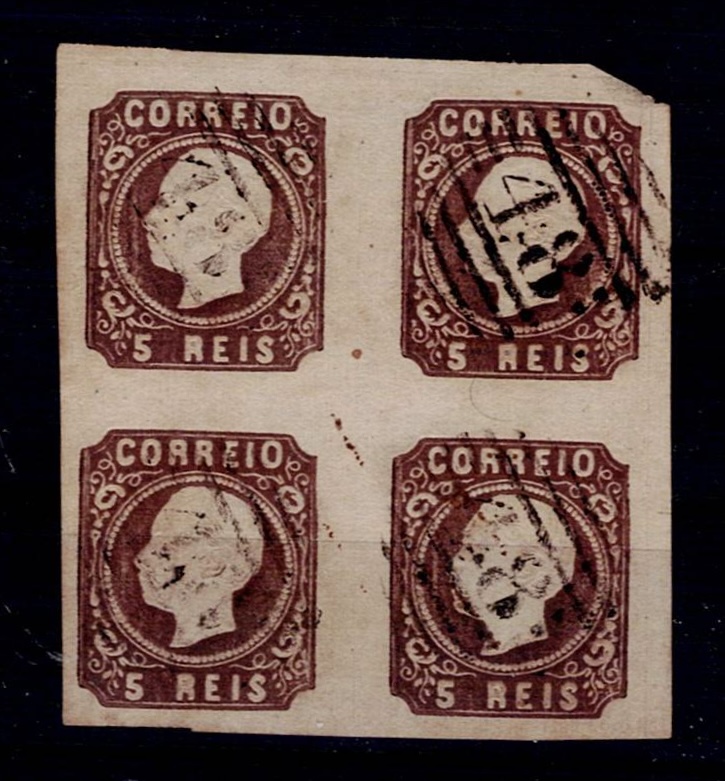 1790 imageAzores 1862-64 Precursors – D. Luis I Borja Freire. QUADRA of Mf#14, 5 réis, brown, smooth paper. Used copies, with good to very good margins, in good colour, with the upper right corner cut off, not affecting any stamp, without repairs, obliterated stamps with a 4-3-4 type stamp struck in black “48 – ANGRA (AZORES)”. Catalogue value € 480 .(Image 1)