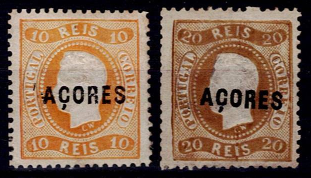 1791 imageAzores 1868 D. Luis curved ribbon, notched. Stamps Mf#7+8 of 10 reis yellow and 20 reis bistre on smooth and notched paper 12 3/4. New stamps, ungummed or with gum and hinge and paper adhesion, with good color and some soiling. Catalog value €200.(Image 1)