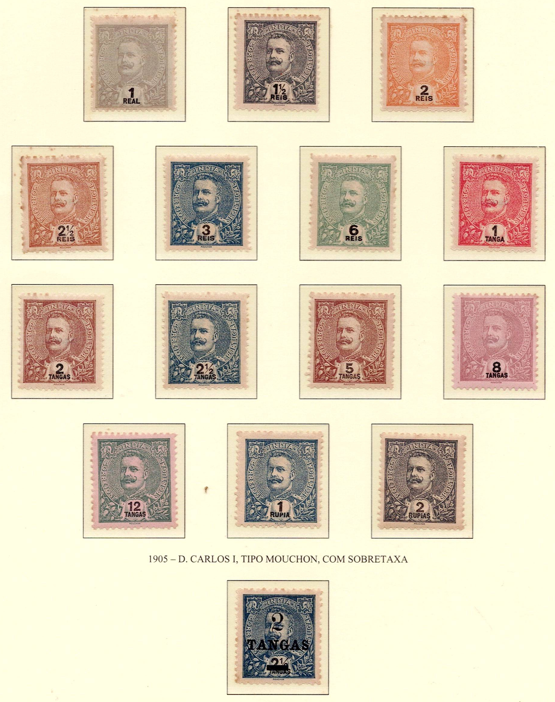 India 1903+1905 D. Carlos, Mouchon + 1900 D. Carlos with surcharge. 2 complete sets of stamps