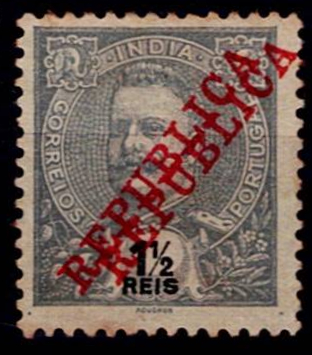 India 1911 D. Carlos Mouchon with "Republic" overprint. Stamp Mf#201, 1.5 reis slate with DOUBLE