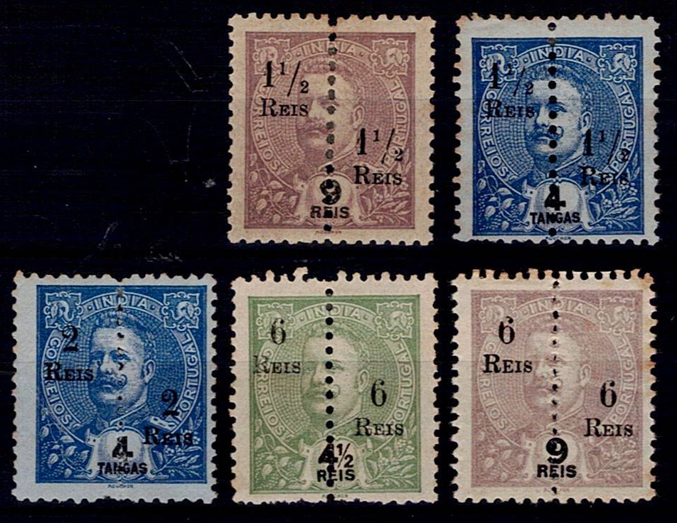 India 1911-13 D. Carlos, perforated in the middle and with surcharge. Incomplete series Mf#217-221. New
