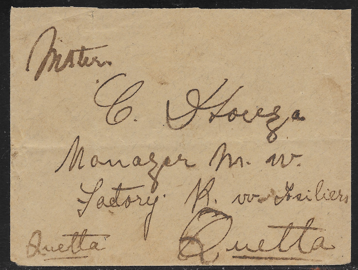 on 9 reis grey-lilac Carlos Mouchon issue (CE 221). A scarce and non-philatelic use of the bisected issue. “Mapuca” single ring post mark, “Nova-Goa” transit mark and light “Quetta” receiving mark. Roughly opened.(Image 1)
