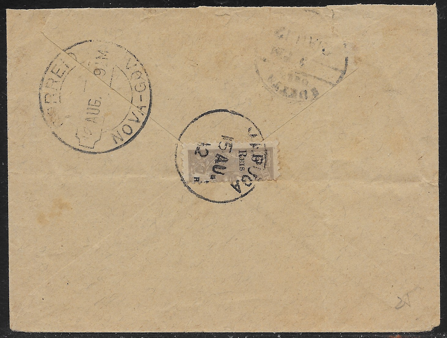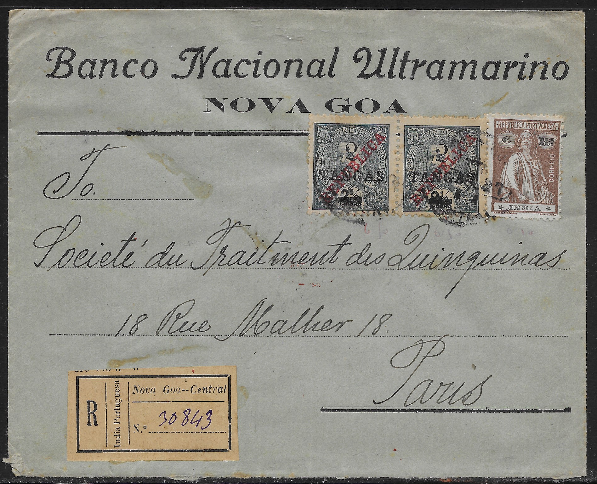Ceres issue (CE 261) and a pair of overprinted 2 tangas on 2 1/2 tangas Carlos Mouchon issues (CE 313). A late and scarce usage of the overprinted Carlos Mouchon issue on Banco National Ultramarino (BNU) envelope. “Nova-Goa” registration label on the