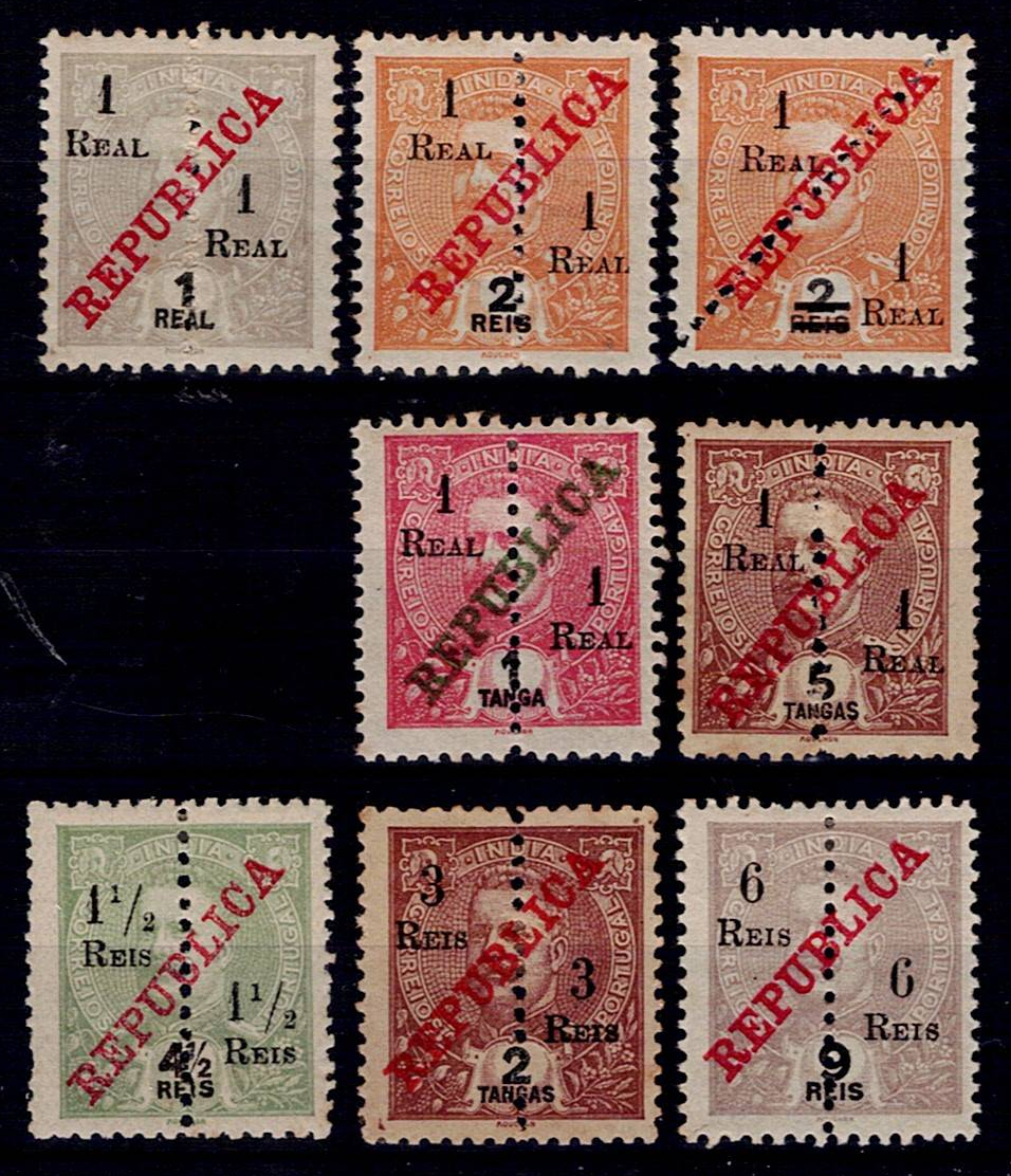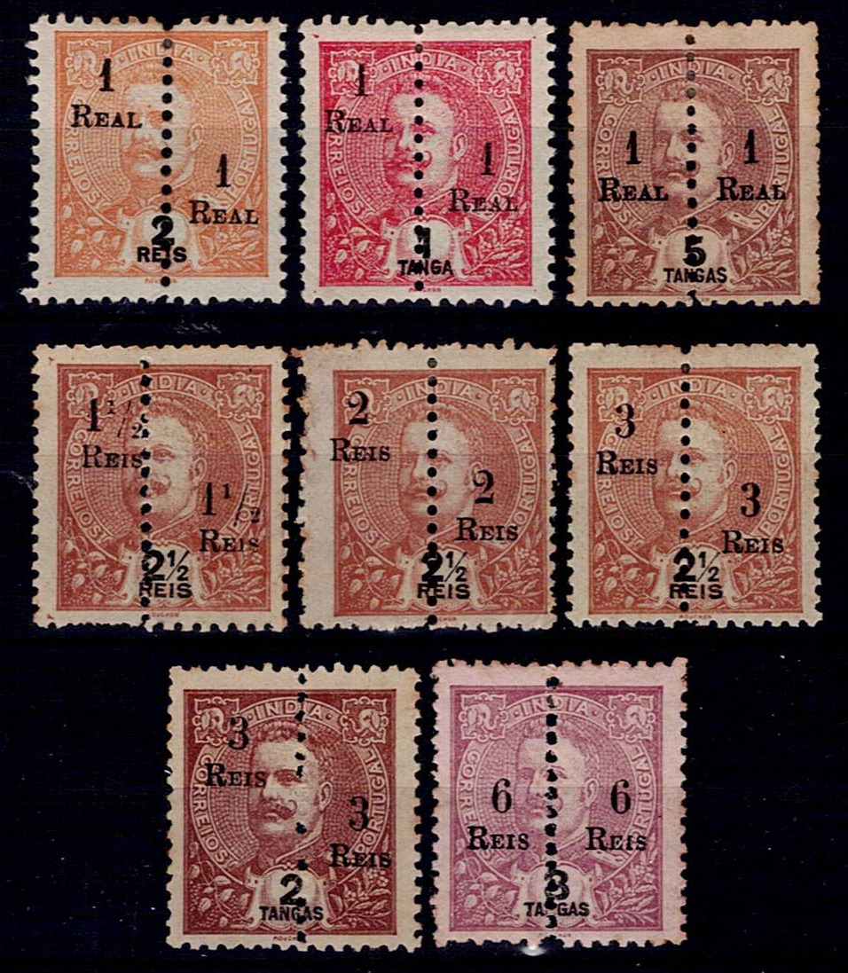 India 1911-13 D. Carlos, perforated in the middle and with surcharge. Complete series Mf#230-237