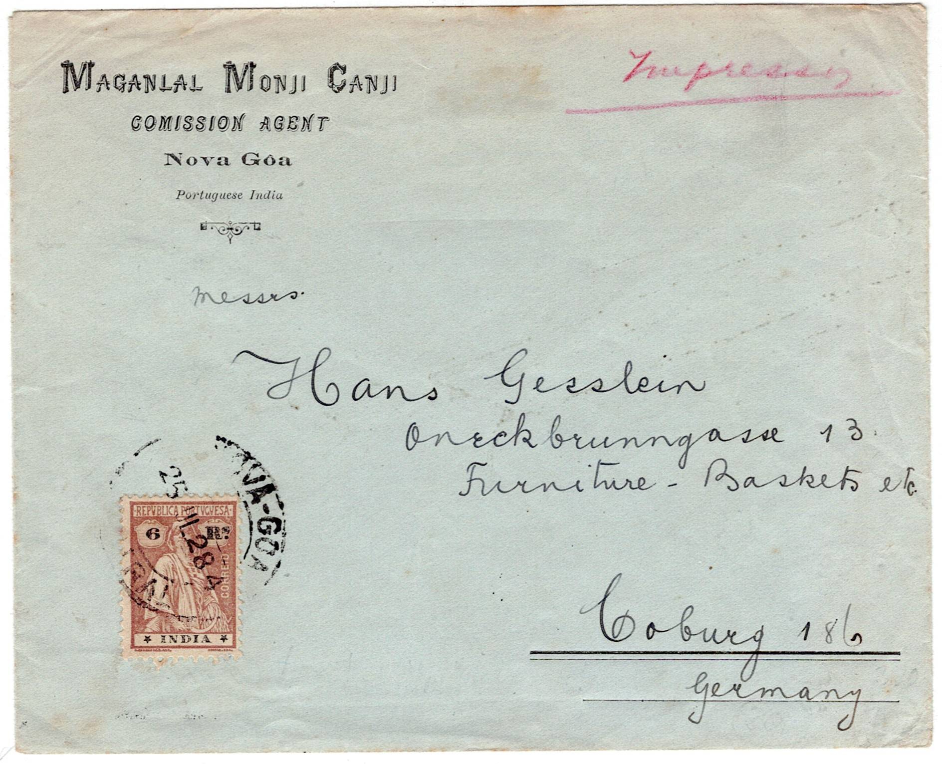 India. Letter sent from Nova Goa on 7/25/1928, to Coburg, Germany, postage of 6 reais, Cers, dent satin