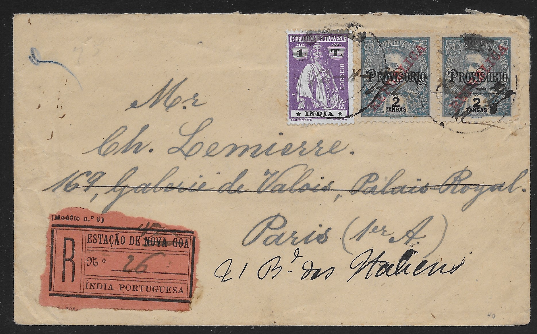 India 1919 registered cover from Velha-Goa November 12th to Paris and redirected. Late usage of Carlos