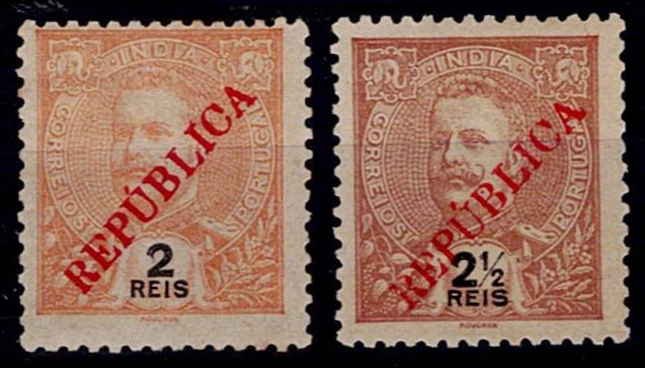 India 1914 D. Carlos I, Mouchon with local Republic overprint. 2 stamps Mf#273+274, 2 reis + 2.5 reis,