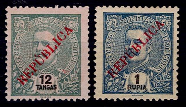 India 1914 D. Carlos I, Mouchon with local Republic overprint. 2 stamps Mf#278+279, 12 tgs + 1 Rupee,