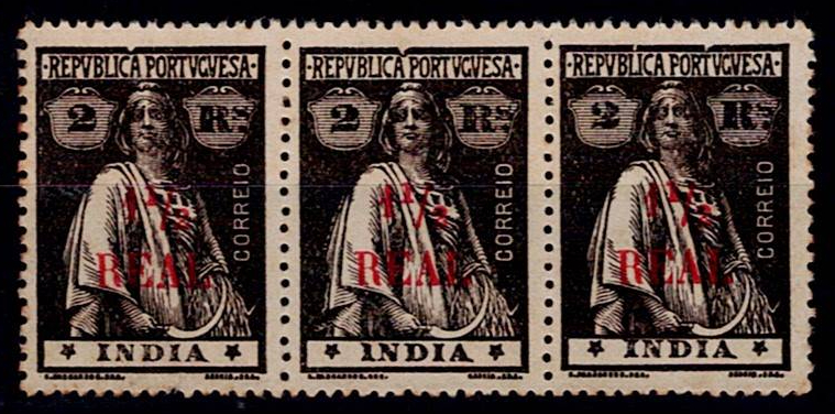 India 1022 Ceres with surcharge. Strip of 3 stamps Mf#322, 1.5 r. s/ 2 reais, perforation 15, all with