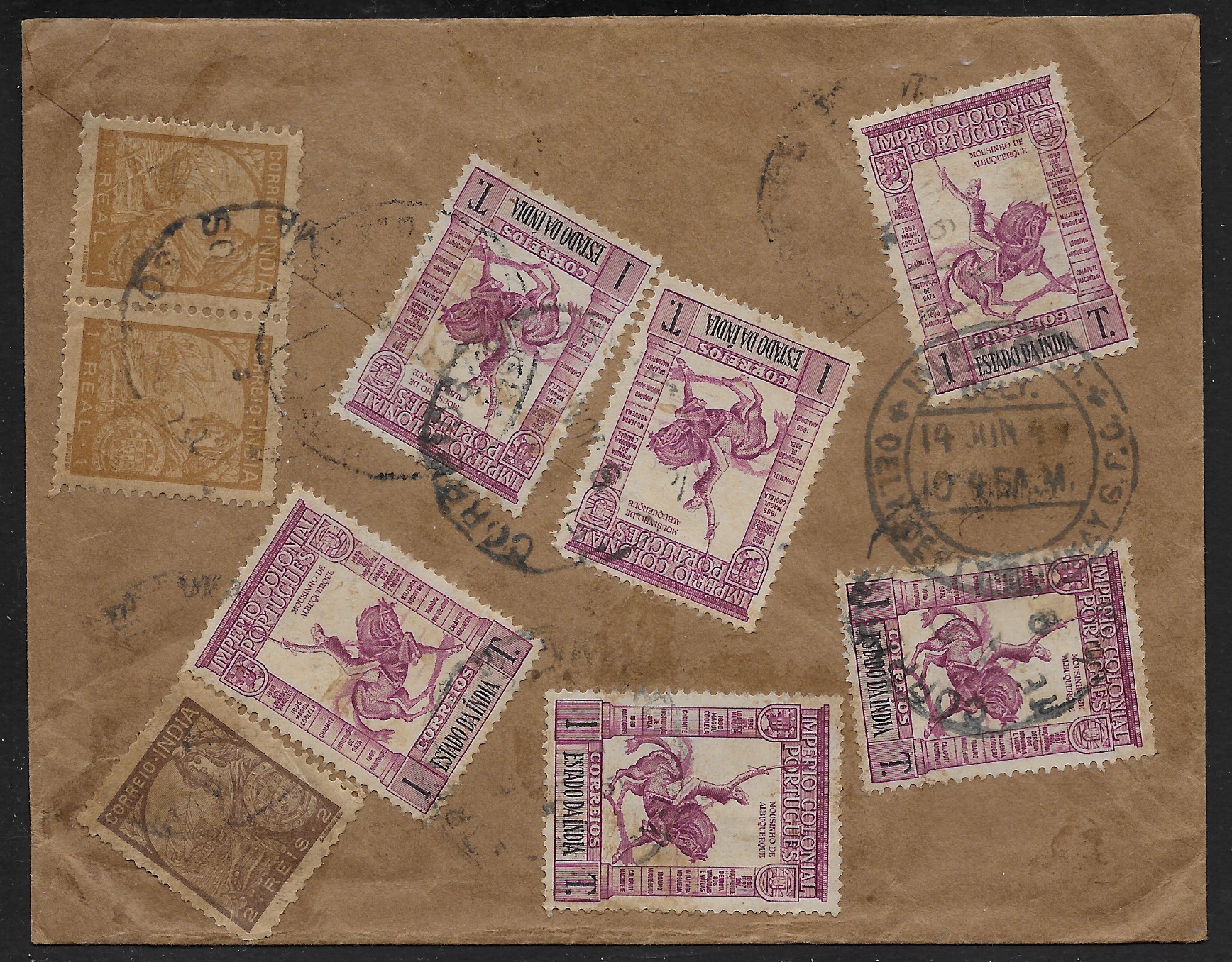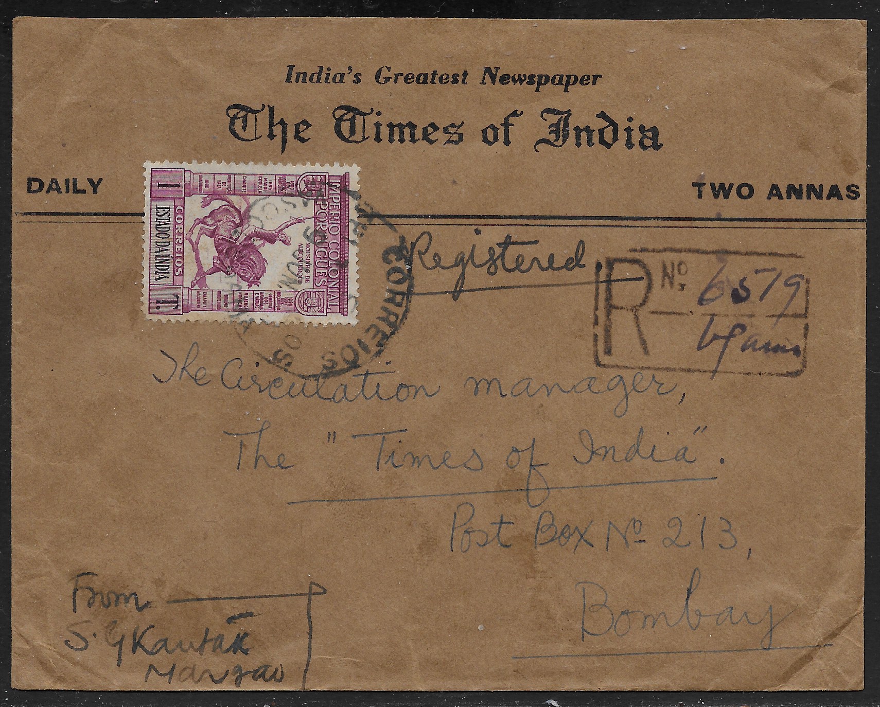 Padroes issues (CE 333), a single 2 reis Padroes issue (CE 334), seven 1 tanga Imperio issues, one on the front and 6 on the back (CE 353). “The Times of India” envelope. A black boxed “Vasco da Gama” registration handstamp on the front. Scarce.