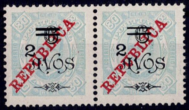 1999 imageMacao 1919, D. Carlos I, with surcharge. PAIR of Mf#245 WITHOUT SCISSOR CUT, 2 avos s/ 6 avos s/ 80 reis, green, porcelain paper with 11 3/4 perforation. New stamps, without gum as issued, without hinge sign with good relief and good color. Catalogue value € 300.(Image 1)