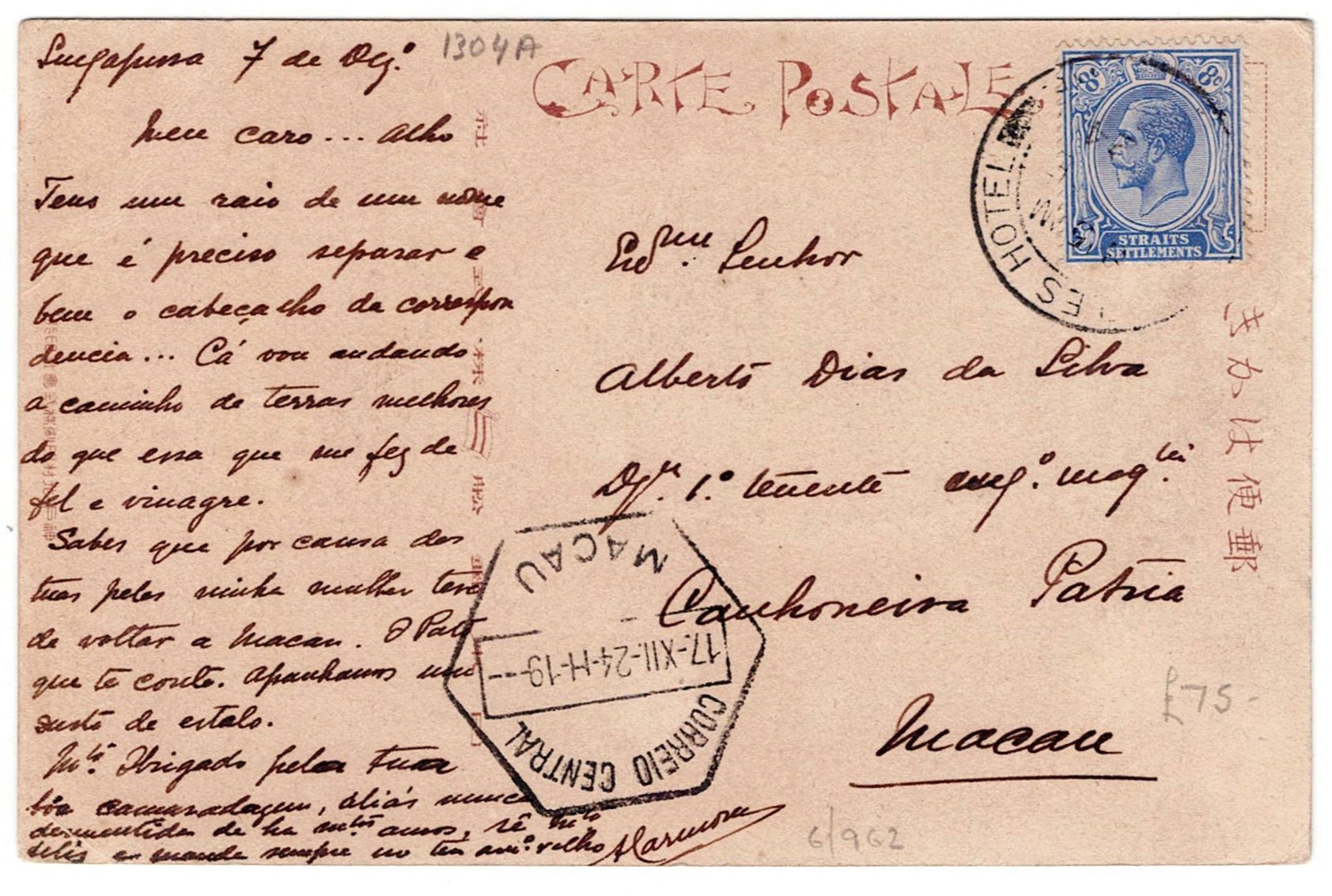 2000 imageMacau 1924. Singapore Illustrated postcard sent from Singapore, 8 cents postage, unused at the Rafles Hotel, to Macau, where it arrived on 17.12.(Image 1) (Image 2)