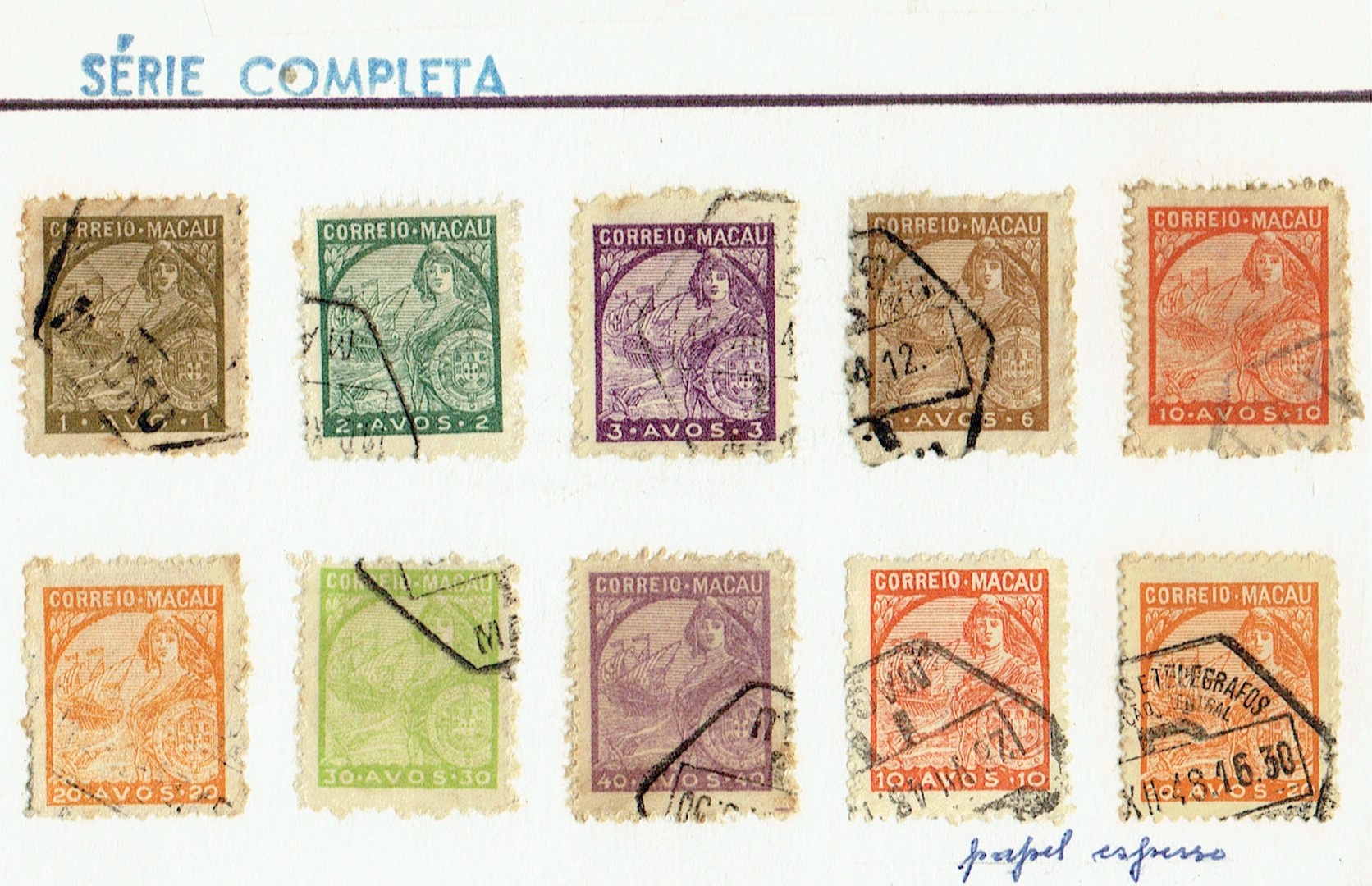 2002 imageMacau 1942 Patterns, lithographed locally. Complete series of Mf#317-324 in USED stamps, hinged, without defects or repairs, with good color. Catalog value €67.(Image 1)