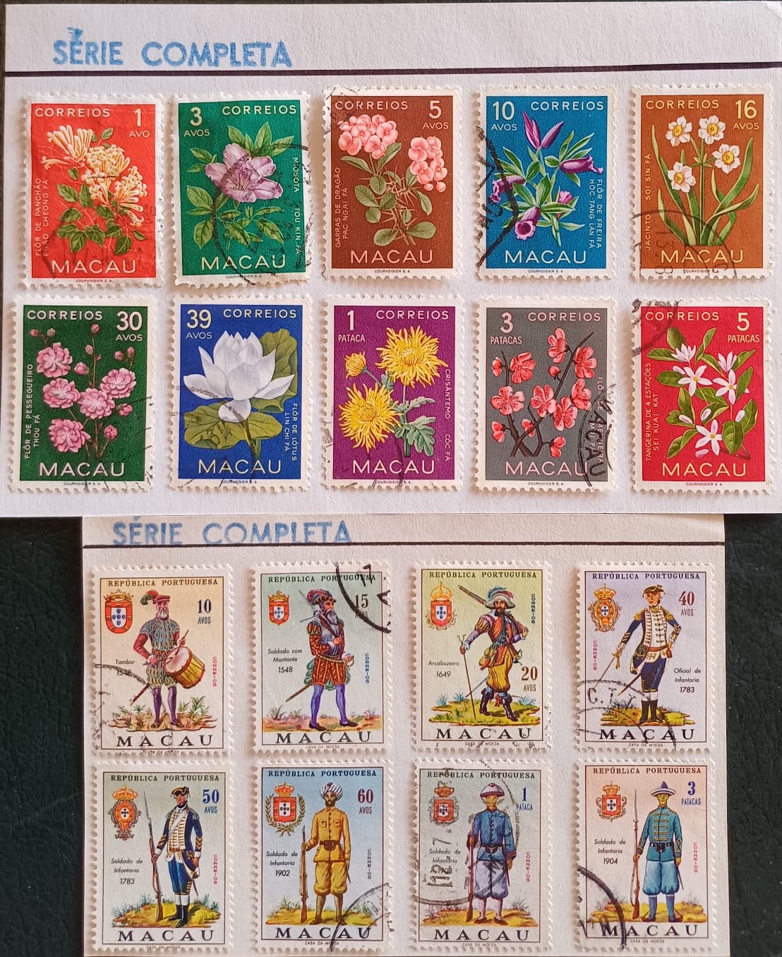 2004 imageMacau 1953 + 1966 Flowers and Macau Uniforms. 2 complete sets of stamps Mf#374-383 + Mf#407-414 on used postage stamps, on exhibition sheets, bound with kerneiras. Catalogue value €38.(Image 1)