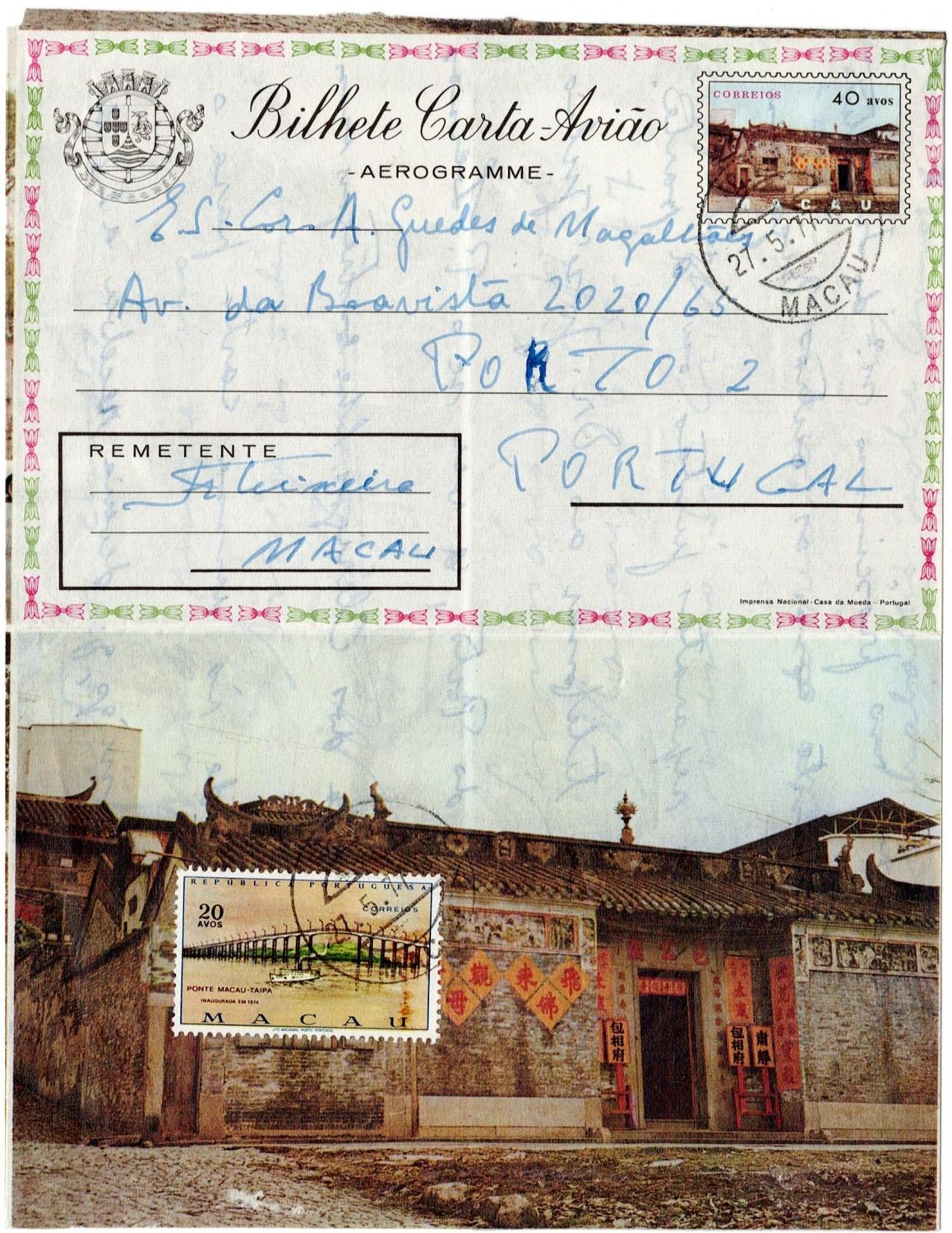 2006 imageMacau. 1977. Aerogram of the Kong Miu Pagoda, 40 cents, with an additional 20 cents stamp of the Macau-Taipa bridge, cancelled on May 27, 1977, for Portugal.(Image 1) (Image 2)